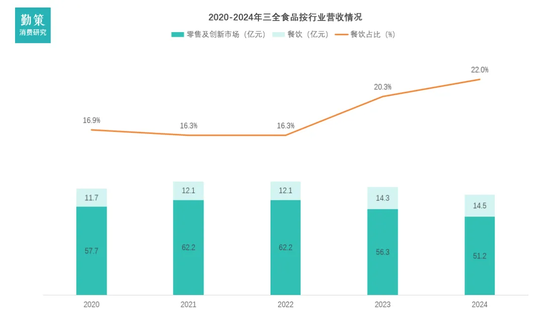 2021-2024年期间,速冻菜肴制品的年复合增长率高达约44.9%,显著超过公司整体营收的17.7%,体现了其作为新增长引擎的爆发力。相比之下,速冻调制制品的CAGR约为11.7%,而速冻米面制品CAGR仅为6.0%,均低于整体增速,反映出传统品类面临行业竞争与消费疲软的压力。这一分化趋势说明安井食品的增长动能已从传统优势品类向预制菜为代表的菜肴制品倾斜,但后者增速在2024年降至10.73%,需关注后续可持续性。安井食品呈现出以经销商渠道为核心、多渠道协同发展的格局。经销商渠道收入从36.4亿元增长至123.8亿元,年复合增长率达22.6%,占总营收比重始终稳定在85%左右,成为公司规模扩张的压舱石。商超渠道保持平稳增长,特通直营渠道在服务大客户过程中虽阶段性波动,却强化了B端渗透能力;电商与新零售渠道则从无到有快速崛起,尤其在2023年前后贡献显著增量,体现了公司对新兴消费场景的主动布局。这一结构背后是安井“深度分销”战略的持续贯彻:经销商数量从618家扩展至2,017家,覆盖广度大幅提升;同时单商平均收入从589万元增至614万元,反映渠道赋能与协同效应深化。未来,公司需在巩固经销商网络优势的基础上,进一步优化直营渠道抗波动能力,并整合新兴渠道资源,以构建更具韧性的立体化销售体系。2. 企业案例:三全食品 零售市场承压,餐饮渠道成战略转型支点