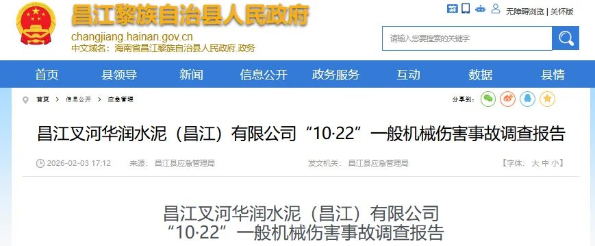 2月3日,海南省昌江县应急管理局发布《昌江叉河华润水泥(昌江)有限公司“10·22”一般机械伤害事故调查报告》。