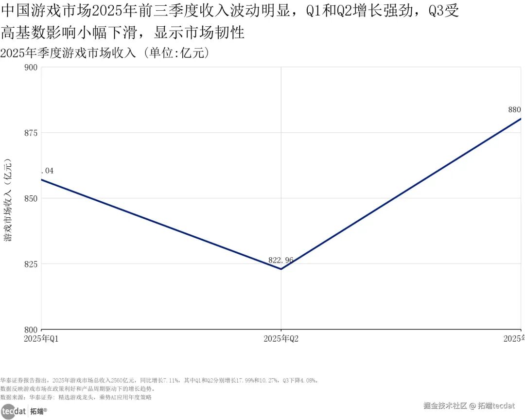 2025年游戏行业穿越周期压力,展现强劲增长韧性,前三季度总收入达2560亿元,同比增长7.11%。季度表现呈现“上半年领跑、三季度回调”的特征,Q1凭借春节档运营活动与新品放量,收入857.04亿元(同比+17.99%);Q2延续增长态势,收入822.96亿元(同比+10.27%);Q3受去年高基数影响,收入880.26亿元(同比-4.08%),但暑期档爆款已带动市场回暖。