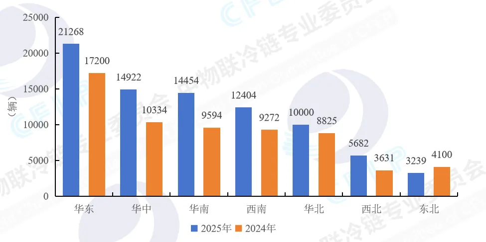 从区域市场冷藏车流入情况来看,2025年华东地区领跑全国冷藏车市场,销量为21268辆,占比为25.95%。华中和西南地区紧随其后,销量分别为14922辆和14454辆,占比分别为18.20%和17.63%。与2024年相比,除东北地区销量同比出现下滑外,其他地区销量均同比增长。西北、华南地区销量增长较快,同比增长56.49%和50.66%,西北地区受果蔬产季驱动以及冷链基础设施网络加速补强的带动,冷藏车销量增长迅速;华南地区主要受政策补贴的带动与刺激,叠加生鲜消费市场、餐饮及零售业催生的城配需求旺盛,轻型车辆增长迅速,带动了整体冷藏车的增长。东北地区受中长途干线物流需求波动影响,重卡销量下降,同时新能源渗透率较低,整体销量有所萎缩,全年销量同比下降21%。