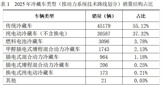 2025年,传统冷藏车仍占市场主位,销量为45179辆,同比增长7.3%,占总销量的55.12%。受第四季度示范城市群政策冲刺影响,广东、河南等地燃料电池冷藏车销量增长迅速,叠加多地对氢能车辆的路权支持,全年燃料电池冷藏车销量为3096辆,同比增长138.15%。各类混合动力车型中,甲醇插电式增程混合动力冷藏车销量最高,为1743辆,同比增长53.3%。