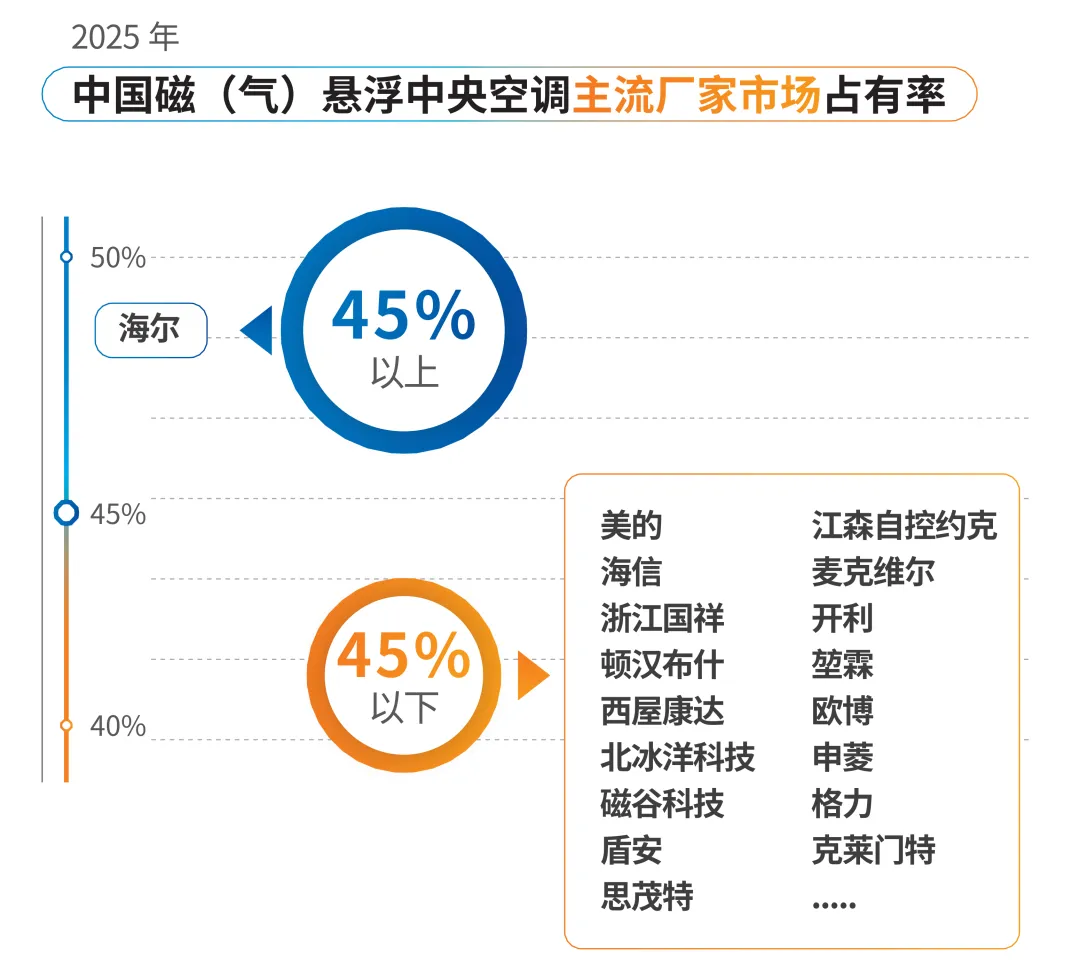 海尔在磁气悬浮领域一直是行业霸主,作为国内率先布局磁悬浮中央空调市场的国产品牌,历经近二十年的积淀与深耕,早已获得行业及用户的认可。自2018年起,在全球磁悬浮空调领域,实现“7连涨、7连冠”,全球每5台磁悬浮空调中就有一台来自海尔,2025年市场表现依旧出彩,稳居市场第一。需要特别值得一提的是,对比2024年,海尔磁悬浮市场份额略微下滑,但是整体份额却大幅提升,这其中离不开常规离心机的拉力。根据企业会议宣讲情况,可以看出,海尔在常规离心机已经焕发了新生,常压、高压,定频、变频,各个系列已经完善,目前在冷量段范围中也覆盖很宽。凭借领先的集成式高效机房技术和综合能源管理能力,成功斩获这一国内最大集成式高效冷站项目,以14套一体化机房、总计13200RT的冷量,为行业打造了绿色低碳制造的标杆样板,也正是这些样板,推动海尔离心机整体份额的上升。