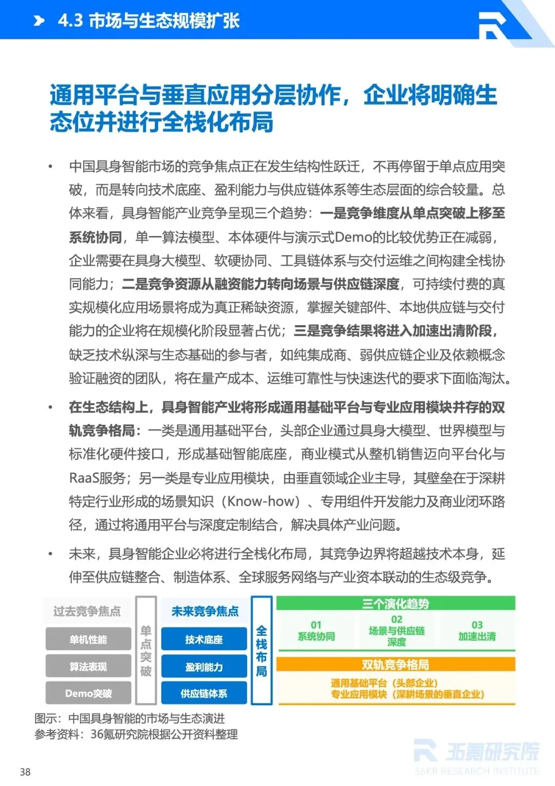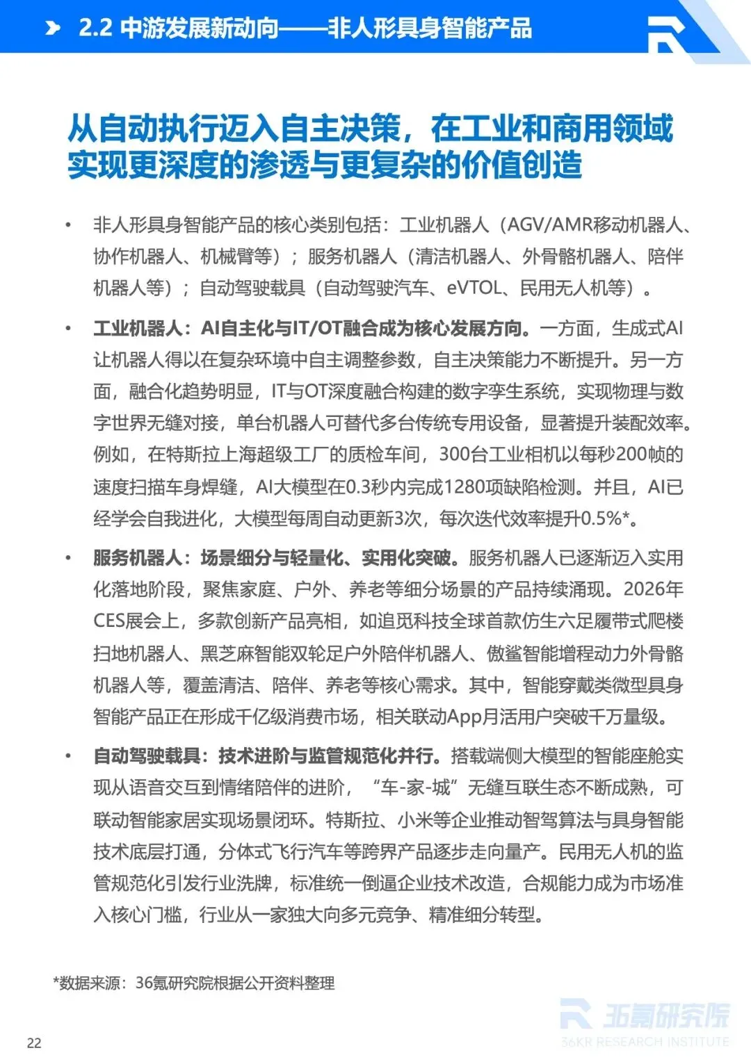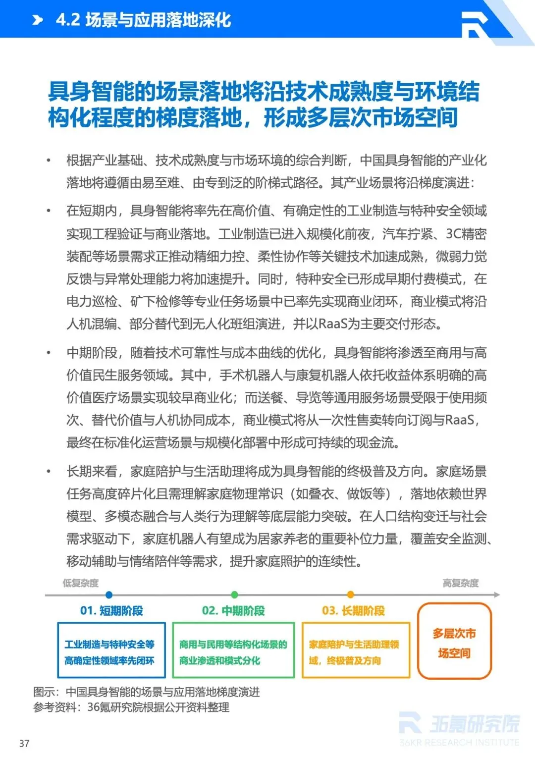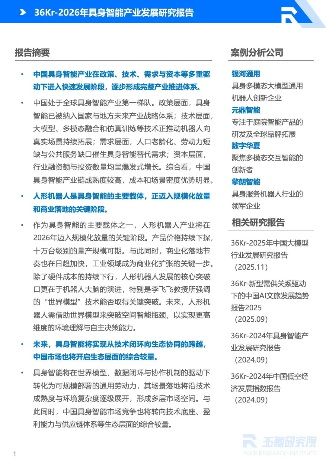 朋友们,今天聊个超有未来感的话题——具身智能!刚啃完36氪那份《2026年具身智能产业发展研究报告》,我最大的感受是:这哪是产业报告,分明是未来生活的预告片!2026年,咱们可能真会在工厂里看到人形机器人拧螺丝,在商场里遇到导览机器人主动搭话,甚至家里有个“机器人管家”帮忙叠衣服。
