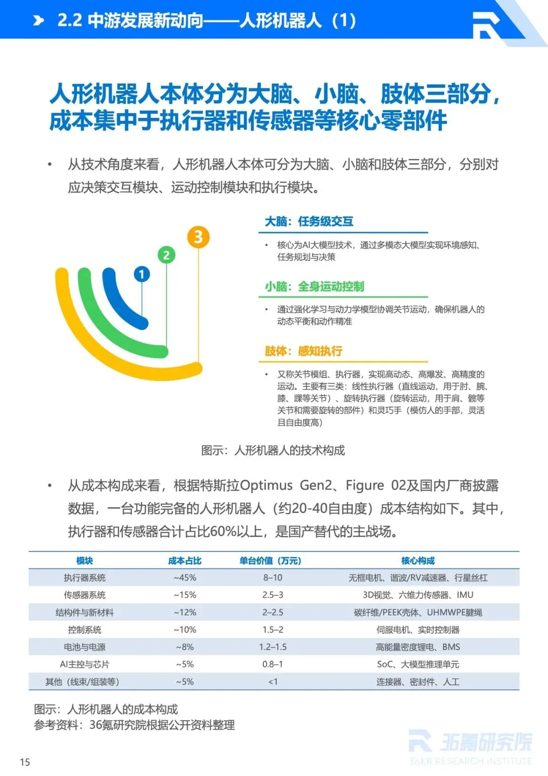 成本打下来:执行器+传感器占成本60%,国产替代正在加速。虽然高端力传感器、丝杠还靠进口,但谐波减速器国产化率已超50%,整机成本能压到海外的50%。