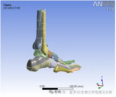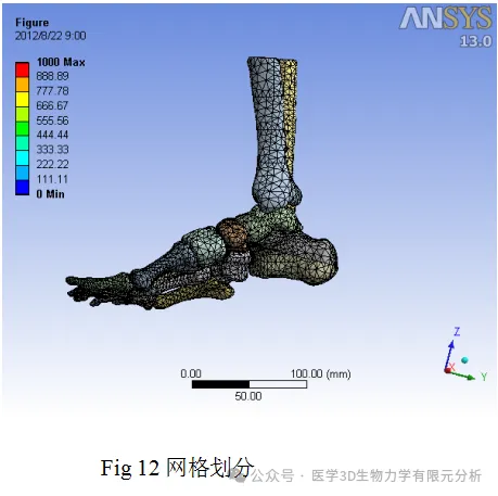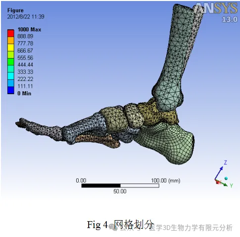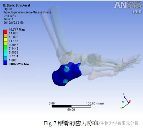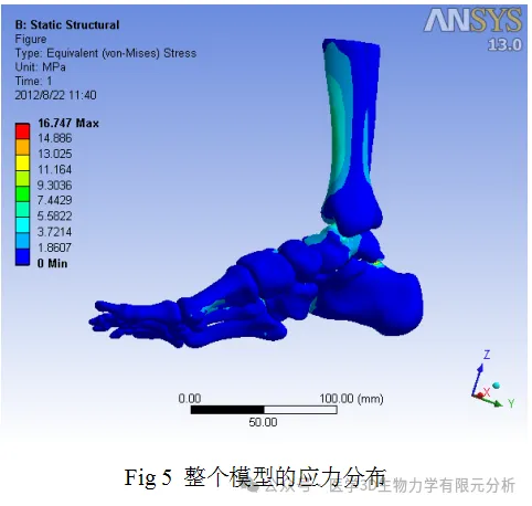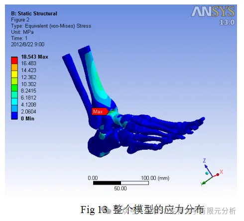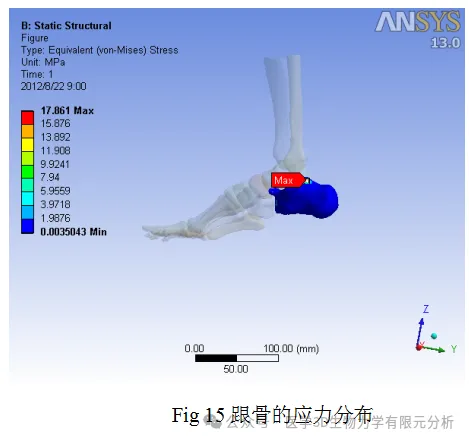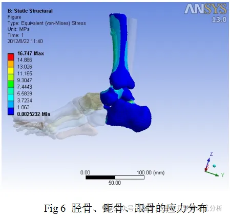从上面应力图中可知道,整个模型产生的最大应力为****Mpa,最大应力位于胫骨与距骨的接触位置。