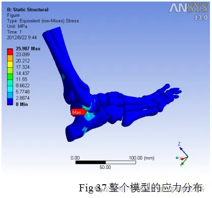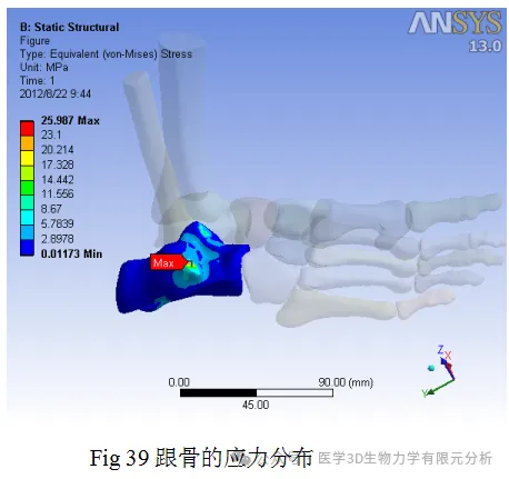 从上面应力图中可知道,整个模型产生的最大应力为25.987Mpa,最大应力位于跟骨与距骨的接触位置。