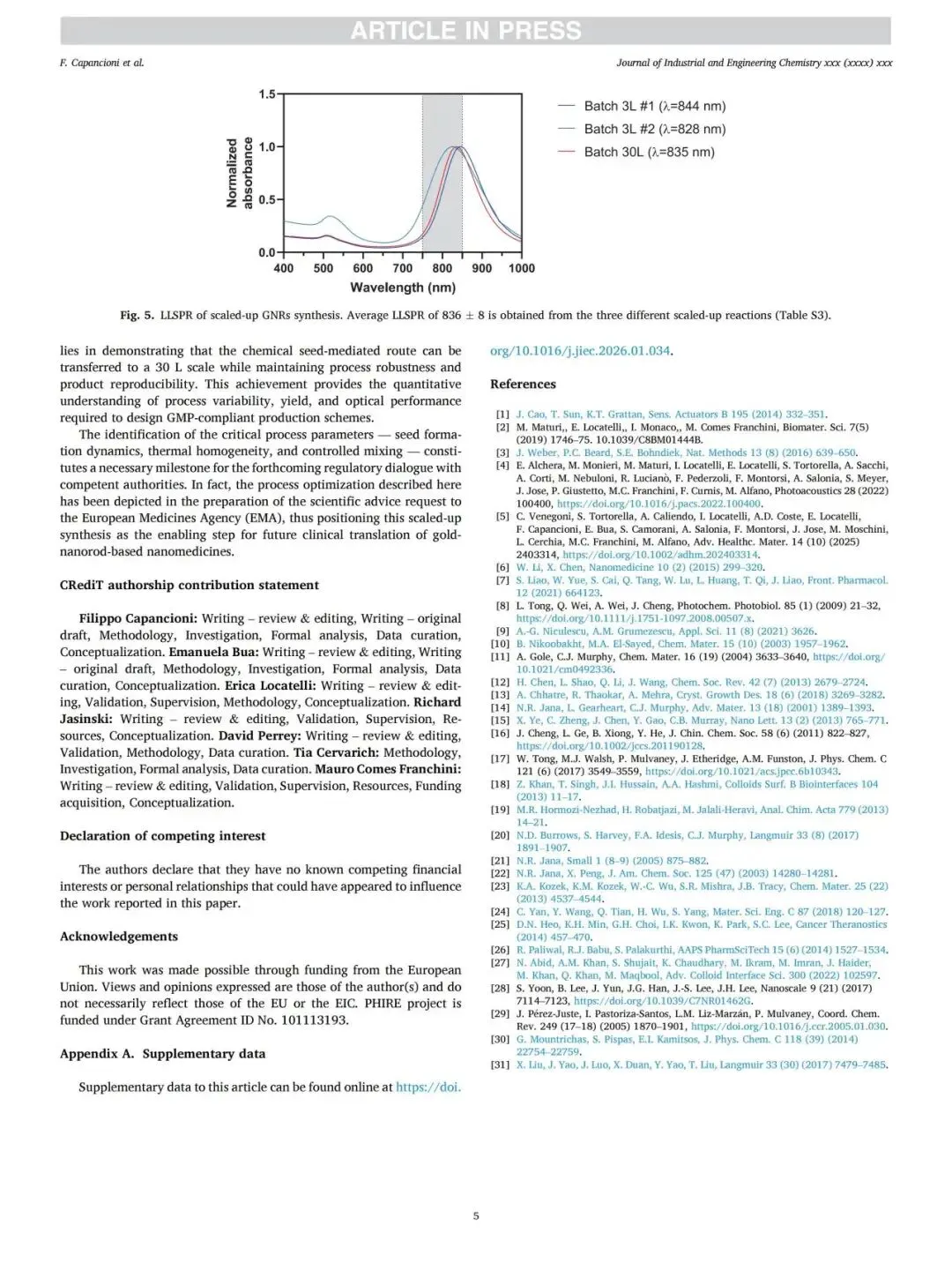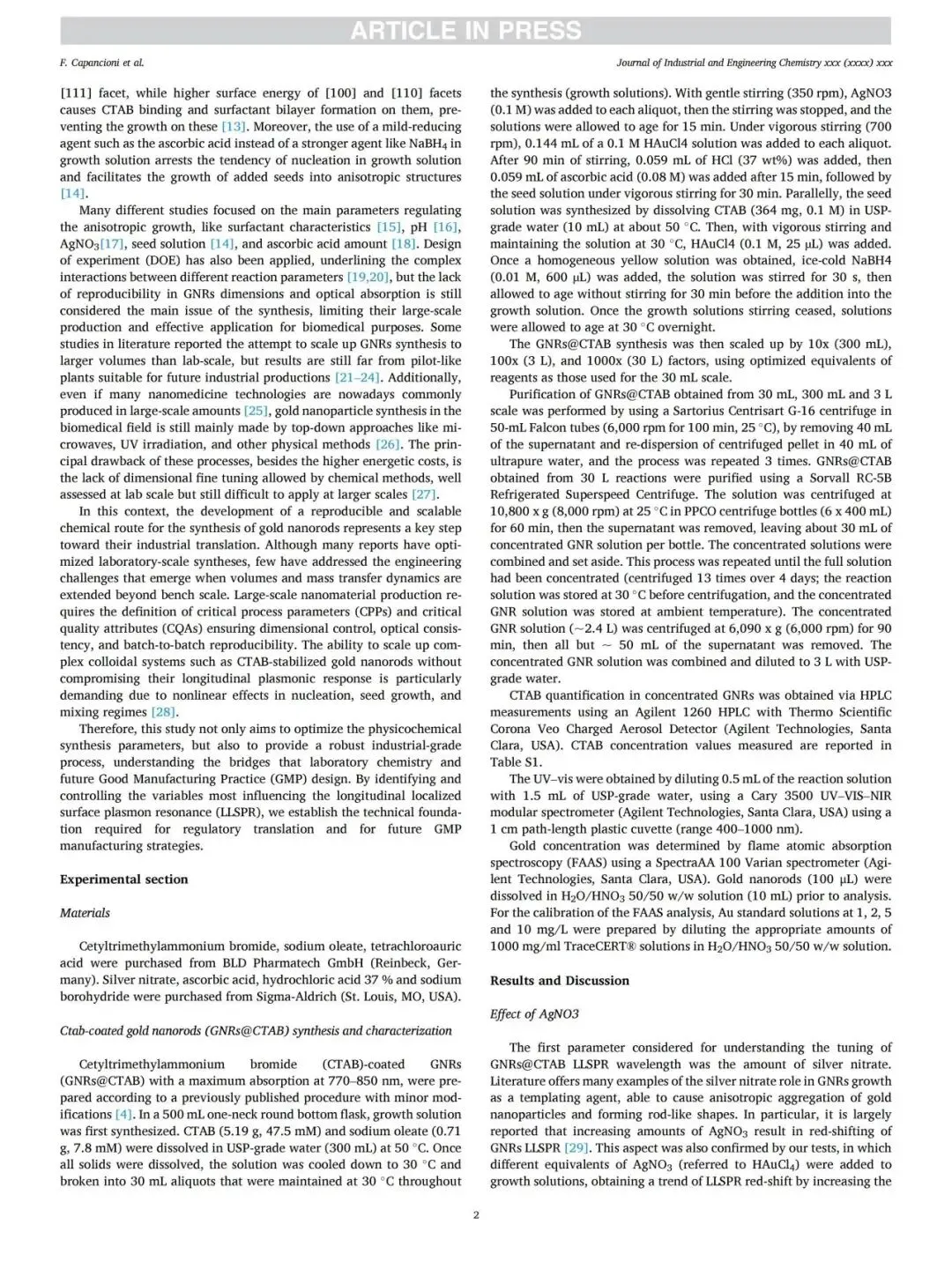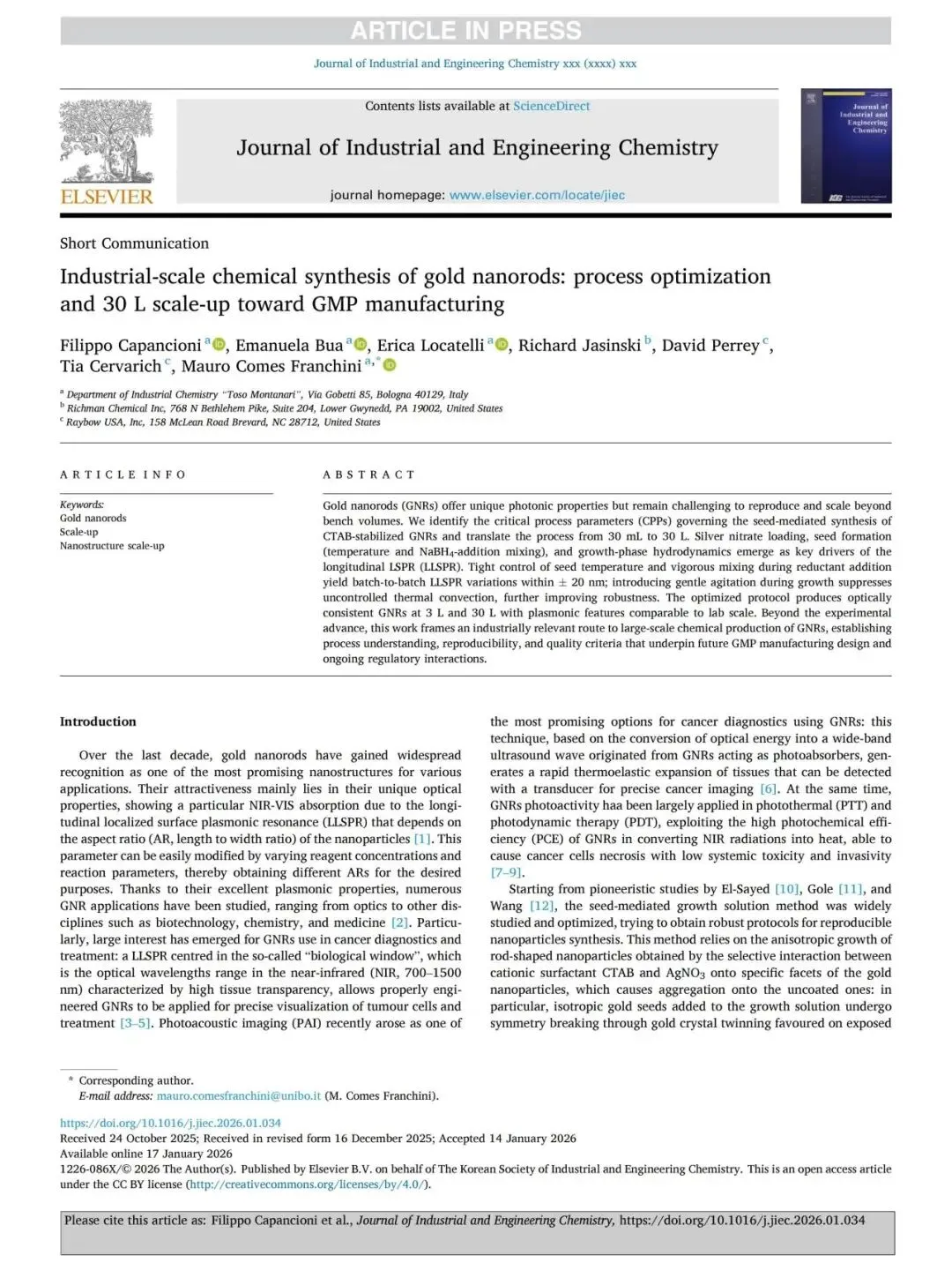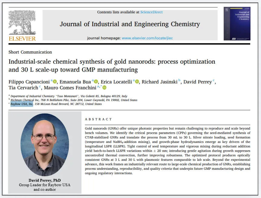 近日,九洲药业美国子公司 Raybow USA 合著的研究论文“Industrial-scale chemical synthesis of gold nanorods: Process optimization and 30 L scale-up toward GMP manufacturing”正式发表于国际权威期刊 《Journal of Industrial and Engineering Chemistry》。论文由 Raybow USA 联合意大利博洛尼亚大学工业化学系 Toso Montanari 团队以及Richman Chemical Inc.共同合著,围绕金纳米棒从实验室制备向工业化规模放大的关键工艺展开研究,为后续应用提供了稳健可靠的技术基础。