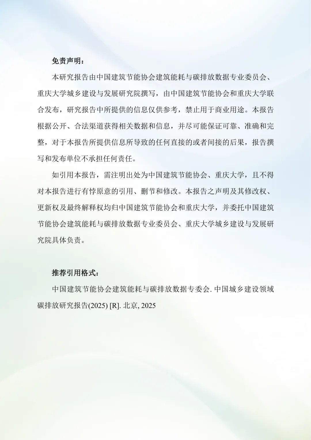 中国城乡建设领域碳排放研究报告(2025)由中国建筑节能协会建筑能耗与碳排放数据专业委员会、重庆大学城乡建设与发展研究院撰写,由中国建筑节能协会和重庆大学联合发布。