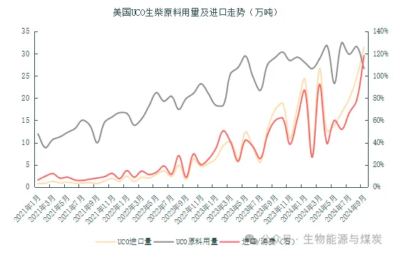 美国联合航空自2016年起就将SAF纳入其常规运营,截至2023年,美国从中国进口的地沟油量激增600倍。2024年,UCO在美国生物柴油原料中的占比达到21%,仅次于豆油。