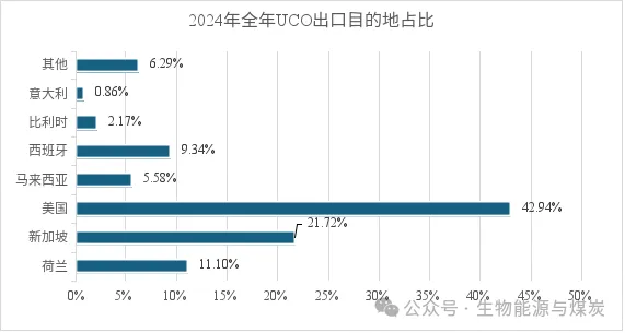 2024年全年中国UCO出口目的地占比分别是:美国126.7万吨占比42.94%,新加坡64.09万吨占比21.72%,荷兰32.75万吨占比11.1%,西班牙27.57万吨占比9.34%,马来西亚16.47万吨占比5.58%。