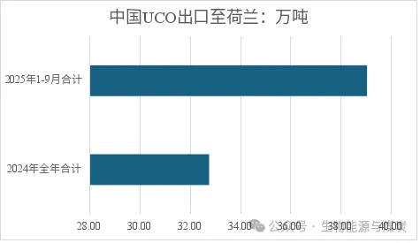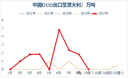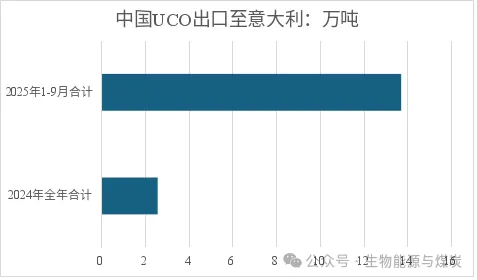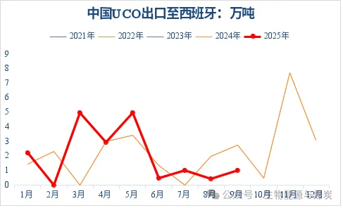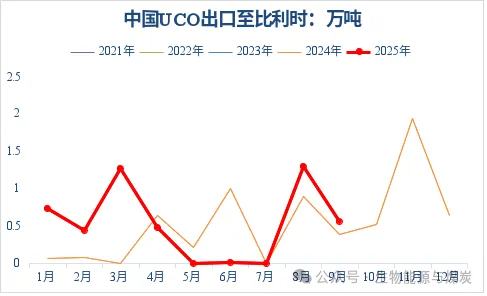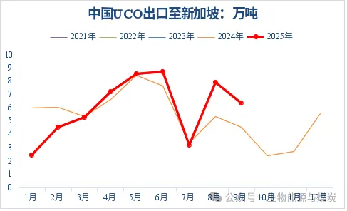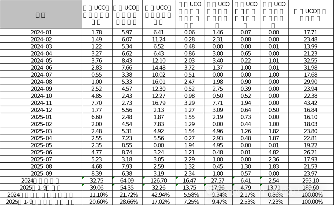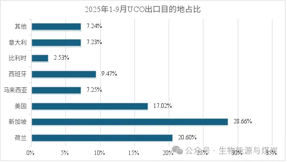 2025年1-9月中国UCO出口目的地占比分别是:新加坡54.35万吨占比28.66%,荷兰39.06万吨占比20.6%,美国32.26万吨占比17.02%,西班牙17.96万吨占比9.47%,马来西亚13.75万吨占比7.25%,意大利13.71万吨占比7.23%。