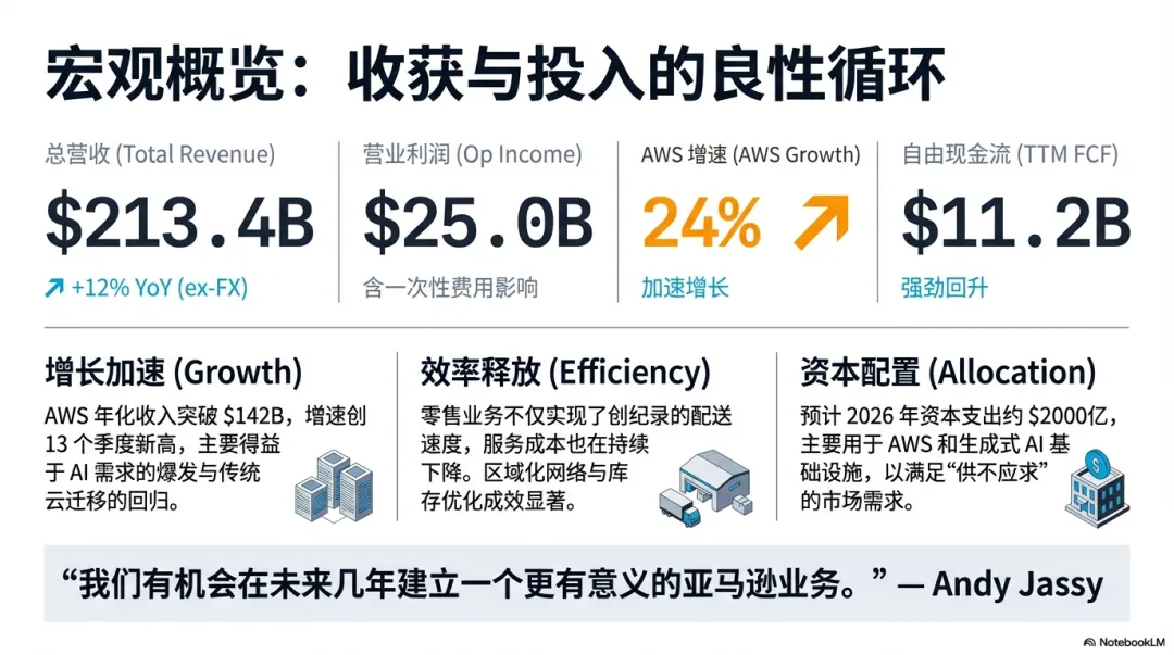 亚马逊的最新财报把 AI 讲成了公司的“底层结构”,他们把AI同时铺在三条战线上:AWS 继续当现金牛且越跑越快,零售体系在悄悄换骨,另外还有几笔看似分散却可能决定下一个十年的下注。