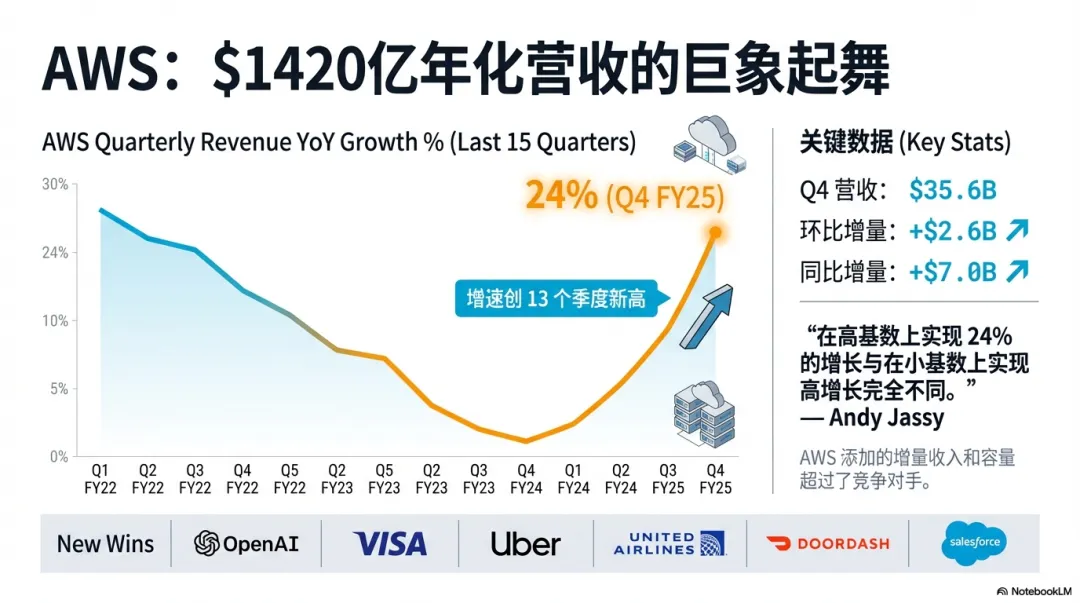 先看最震撼的部分:AWS 的增长在加速,季度同比增速到了 24%,这是过去 13 个季度里的最快增速之一,而 AWS 的年化运行率已经冲到 1420 亿美元。