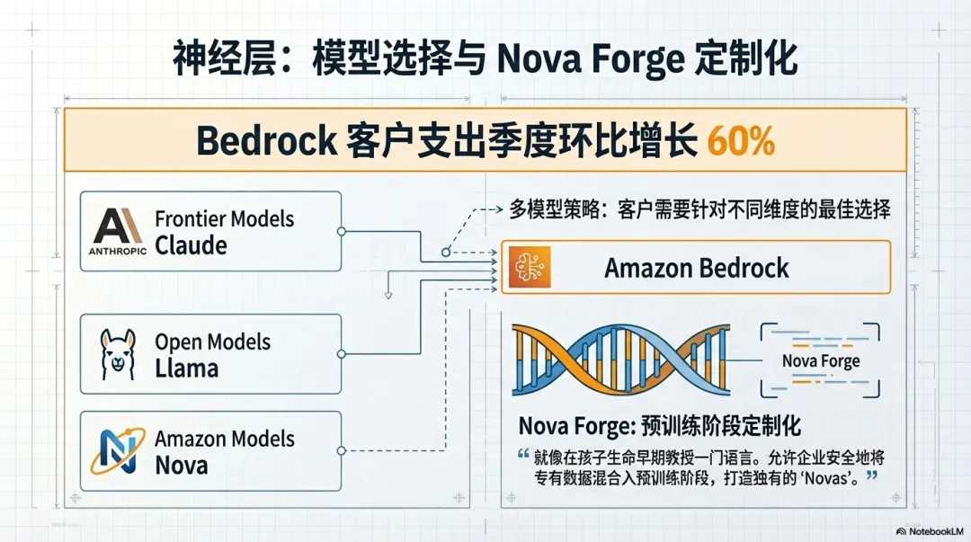 再往上一层,是模型定制。亚马逊提到NovaForge,它的叙事很有意思:与其等模型“毕业”再培训,不如在更早阶段就把企业自己的知识体系和数据安全地融进去。