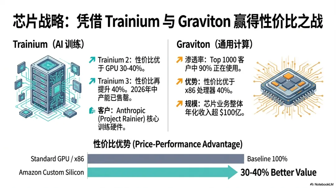 之所以还能加速,答案其实藏在另一个更底层的数据里:自研芯片业务(Graviton + Trainium)已经做成了年化超过 100 亿美元的规模,并且仍保持非常快的同比增长。