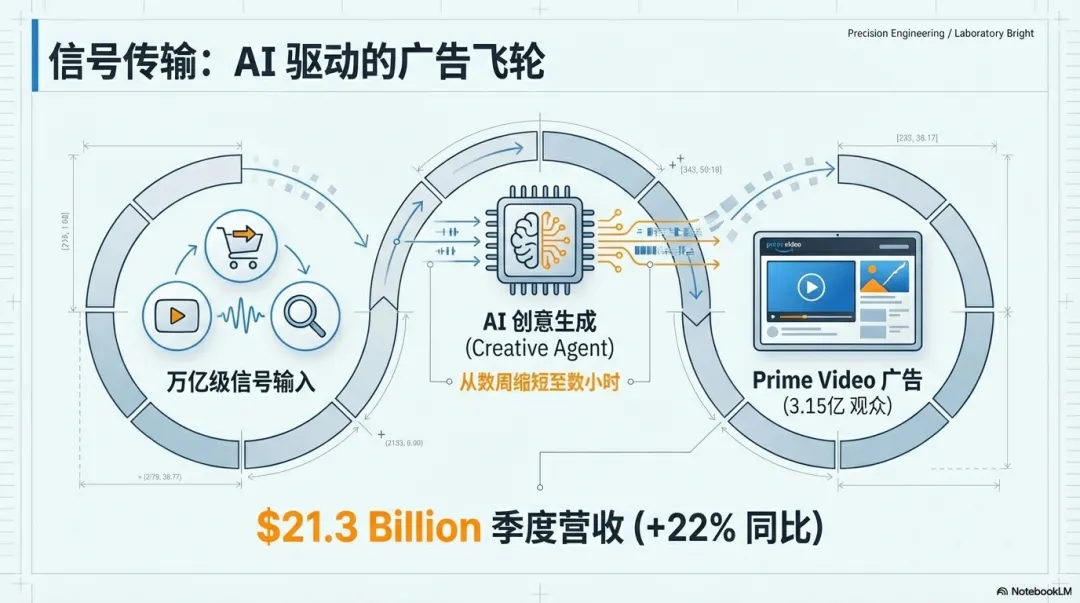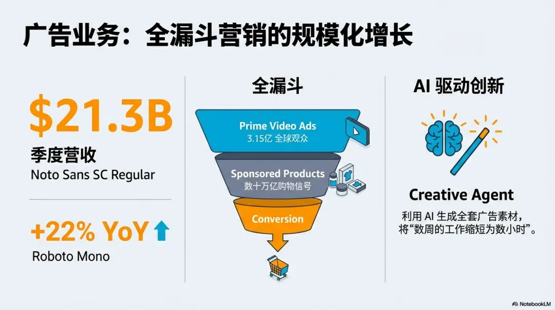 这也是为什么广告业务在亚马逊体系里是被忽视的重要增长力量:财报里,广告业务季度收入达到 213 亿美元,同比增长 22%。它并不是一门孤立生意,而是零售与履约体系长期积累的自然产物:如果能够知道一个人何时可能用完牙膏、偏好哪种麦片、是否正在考虑露营,平台就拥有了广告世界里最贵的东西——可转化的意图。