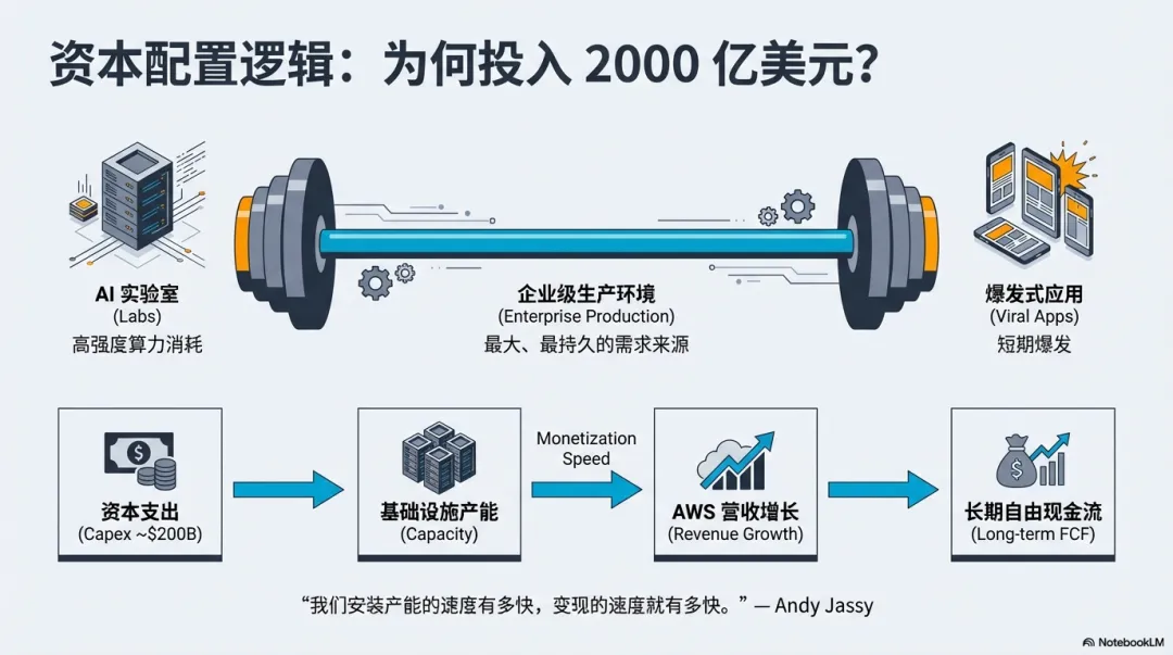 市场之所以会反复争论亚马逊的AI投入,并不只是担心它花钱多,而是担心这类投入的回报周期更长、节奏更不均匀:短期利润率可能被折旧与费用压住,但一旦产能爬坡完成,供给释放的那一刻又会直接决定收入的上限。
