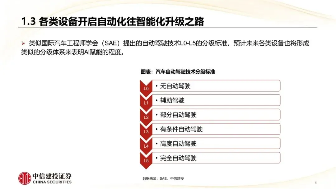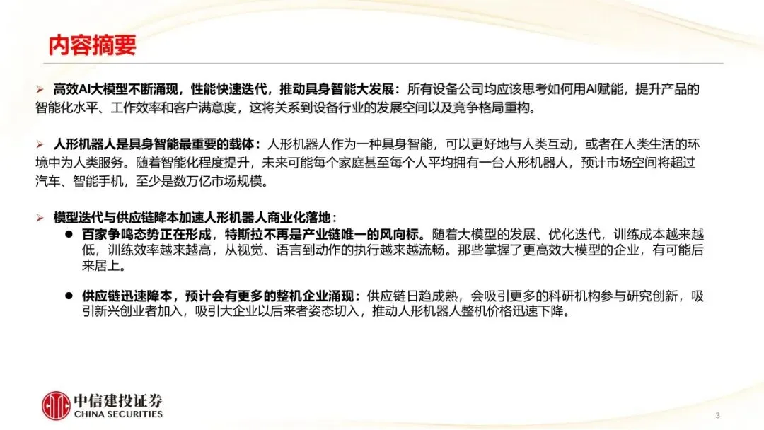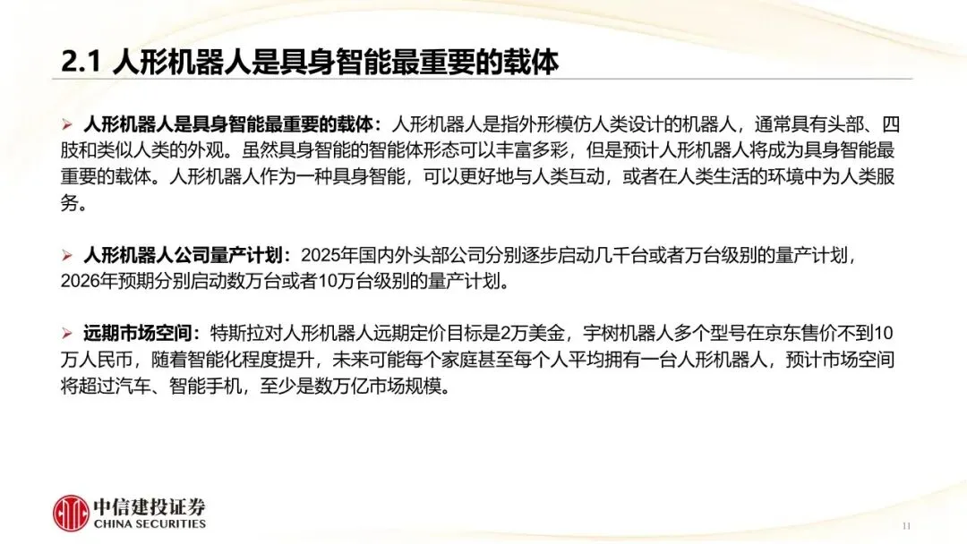 人形机器人是具身智能最重要的载体:人形机器人作为一种具身智能,可以更好地与人类互动,或者在人类生活的环境中为人类服务。随着智能化程度提升,未来可能每个家庭甚至每个人平均拥有一台人形机器人,预计市场空间将超过汽车、智能手机,至少是数万亿市场规模。