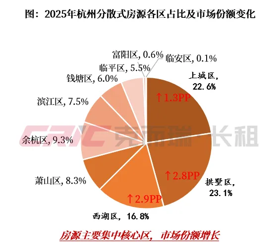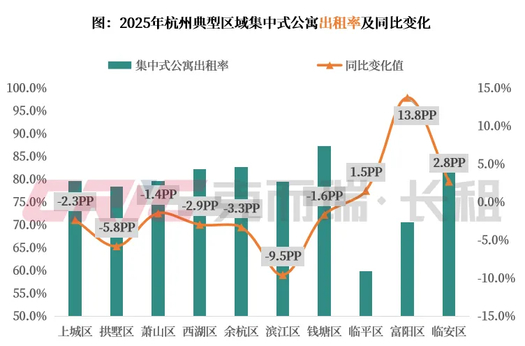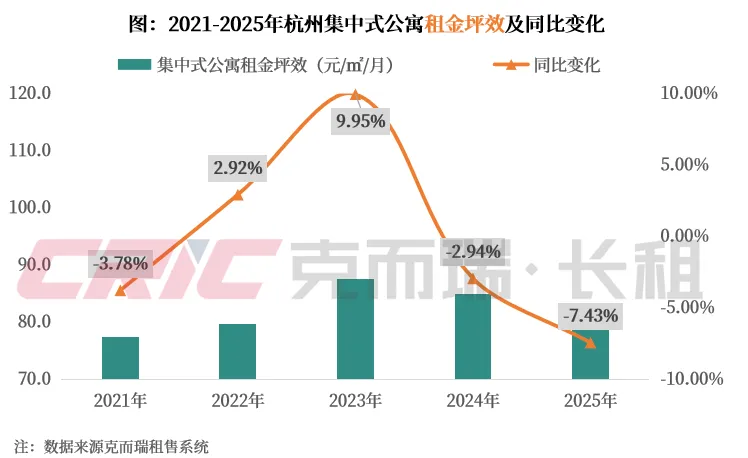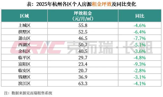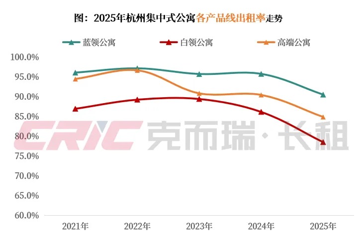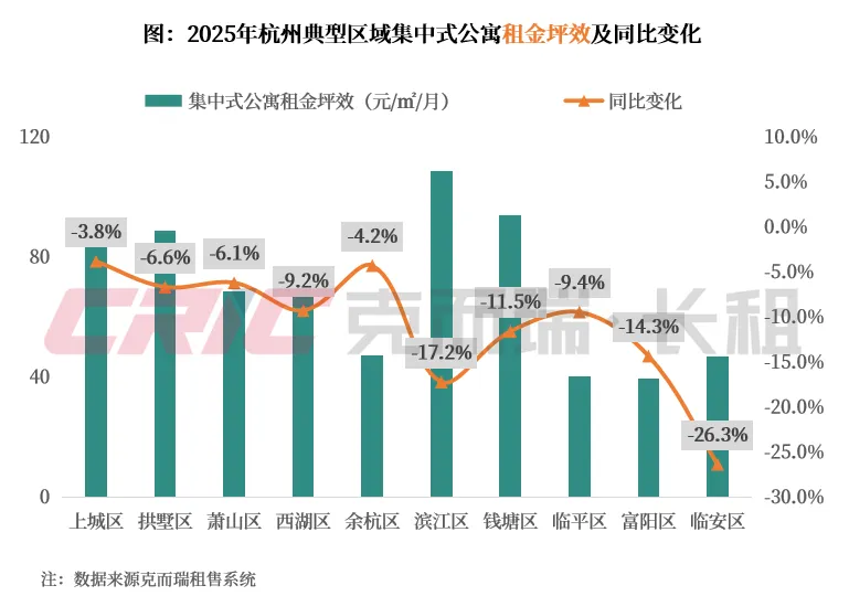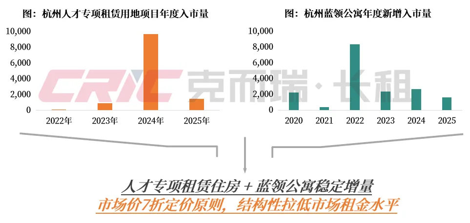 白领公寓占比超77%市场绝对主导,蓝领公寓占比约2成;蓝领公寓和人才专项租赁住房7折定价原则,增量稳定,结构性拉低城市租金坪效截止2025年,白领公寓市占超77%,蓝领公寓重要补充,占比约2成,金领公寓和服务式公寓市占在3%以内,高端市场容量相对有限;杭州的蓝领公寓是政府推出的保障性租赁住房,主要面向外来务工人员,帮你解决“租房难、租房贵”的问题,低于同地段市场价7折。人才专项租赁住房是杭州市政府于2018年启动的住房保障项目,旨在改善人才居住条件、降低居住成本,主要面向杭州市认定的人才及高校毕业生群体。租金定价不高于同地段市场价的70%,并根据人才类别实行阶梯式减免。二者近期供应稳定,低租金拉低市场租金水平。蓝领公寓、人才专项租房住房2023年后供应提速,7折定价原则,结构性拉低租金;长租市场规快速增长,出租率波动下滑,但整体仍保持高位运行2023年及以前,城市入市集中式公寓以市场化项目为主,城市租赁需求旺盛,租金小幅上涨,2023年达峰值为87.6元/㎡/月,而后大量蓝领公寓和人才专项租赁住房入市,其特定的市场化房源7折定价原则,叠加市场占比提升,带动城市租金坪效下跌,截止2025年,集中式租金为78.7元/㎡/月,同比下滑7.43%,未来随着城市大量低价保租房项目集中入市,整体租金或延续下滑趋势。随着城市租赁市场规模的快速上涨,出租率同步下滑,但整体仍维持高位运行,2025年出租率为82.1%。核心区需求支撑,租金降幅较小,出租率受分散式增量影响下滑;城市外围新兴区,以价换量效果显著,出租率呈现上涨趋势从分区集中式公寓量价表现来看,临安区租金降幅最高,为26.3%,其次为滨江区、富阳区、临平区,同比降幅均超10%,上城区、拱墅区、余杭区等传统核心区,需求旺盛,租金降幅在5%上下。从出租率来看,传统核心区2025年受分散式房源爆发式增长影响,出租率普遍下滑3%左右。而临安区、富阳区、临平区等城市新型区域,一方面供应较少,一方面基于价格优势,出租率不同幅度的上涨。白领、蓝领公寓随着供应增量,租金和出租率小幅下行趋势;高端公寓受区位、产品等综合因素影响,租金年度变化较大,高端市场容量小,出租率超90%从杭州集中式公寓各产品线年度租金走势来看,服务式公寓因新开项目区位、定位等因素,租金年度变化较大;蓝领公寓按需供应,租金涨后波动企稳为主;白领公寓受保租房集中入市影响,2023年后租金呈下调趋势,目前维稳在70元/㎡/月左右,预计后续呈现小幅下滑趋势;2023年以来市场进入高速增量周期,各产品线年度出租率均呈下滑趋势,其中2025年白领公寓平均出租率78.6%,服务式公寓90.6%,蓝领公寓出租率84.9%,未来仍存上涨空间。上城、拱墅、萧山等城市核心区租赁需求旺盛,可供租赁房源增量,推动市场容量回弹自2021年,供应端剧变导致杭州个人房源供应量逐年下降,近两年个人房源可供租赁房源回弹趋势,2025年,杭州个人房源可供租赁房源累计供应约27万套,同比提升约9%,主要集中在核心城区。分区域看,上城区、拱墅区和萧山区,占比在14-24%区间;余杭区、西湖区和钱塘区占比在10%上下,居第二梯队。供需端租金预期下降,2025年租金同比下降4.9个百分点,各区普降,核心区相对稳定近年来城市个人房源租金坪效波动下滑,2025年租金坪效下跌至43.1元/㎡/月,套均价下跌至3500元/月左右,主要受挂牌房源品质、地段等因素影响,整体呈平稳波动走势;宏观经济影响,居民收入持续收窄,租房成本预算亦在下调,该趋势下,2025年多数个人房源业主选择“以价换量”,杭州整体个人房源租金坪效同比下降4.9%、套均价同比下降5.0%。分区域来看,各区普降,富阳城市外围,租赁需求不足,跌幅最大,达7.7%,上城、西湖等核心区跌幅相对较低。随着集中式市场认可度和规模的同步提升,叠加个人房源低价分流;分散式空置房源大幅上涨,推动2025年可供租赁房源激增从2020年至2025年分散式房源年度供应来看,2020年为市场峰值,达到15.1万套,此后随着集中式公寓的高速入市,波动下滑;2025年市场迎来爆发式回弹,供应达到12.5万套,同比增长超120%;主要集中在拱墅区、上城区和西湖区三个传统核心区,合计占比在60%以上;核心区租赁需求旺盛,但集中式供应特别是保租房,多位于外围区,导致核心区供小于求,为分散式发展迎来窗口期;租金持续下滑趋势,年均降幅约11%,外围区需求支撑不足,降幅超22%2021年-2025年,杭州分散式公寓租金从100.5元/㎡/月下跌至2025年57.0元/㎡/月,年均降幅10.8%;2025年分散式公寓供应激增,租金进一步下跌;分区来看,各区普降,萧山区、余杭区、临安区降幅超22%,拱墅区、西湖区,上城区等城市传统核心区,主要供给,价格降幅在6-10%区间,相对稳定。延续“转化为主、新(改)建为辅”思路,拓展房源多元筹集渠道,保证持续稳定增量立足城市实际,按照“转化为主、新(改)建为辅”思路,通过现有蓝领公寓、人才专项租赁住房、集中式长租公寓等转化,还通过新供应租赁用地新建、利用闲置低效商办厂房等非居住房屋改建等多渠道筹集保障性租赁房源;市住保房管局出台《关于多渠道筹集发展保障性租赁住房的通知》,明确鼓励通过综合开发利用地铁TOD上盖物业和公交场站、建设工业邻里中心、租赁转化富余安置房等多种渠道筹集发展保障性租赁住房,持续增加满足新市民、青年人需求的房源供应。人口与产业双轮驱动,支撑杭