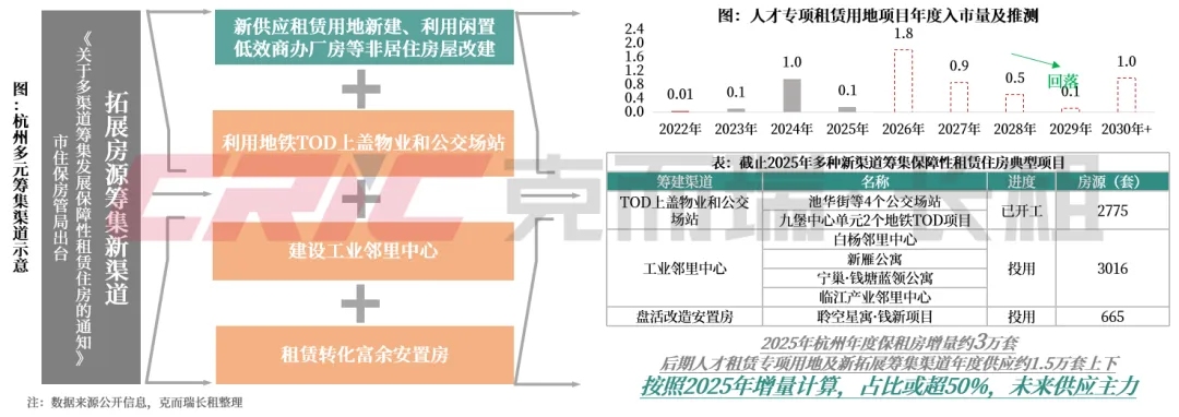 集中式公寓:目前达20.6万套,保租房占比40%,保租房+市场化双轨格局基本成型;核心区需求支撑,租金降幅较小,出租率受分散式增量影响下滑;城市外围新兴区,以价换量效果显著,出租率呈现上涨趋势个人房源:上城、拱墅、萧山等城市核心区租赁需求旺盛,可供租赁房源增量,推动市场容量回弹;供需端租金预期下降,2025年租金同比下降4.9个百分点,各区普降,核心区相对稳定分散式公寓:分散式空置房源大幅上涨,推动2025年可供租赁房源激增;租金持续下滑趋势,年均降幅约11%,外围区需求支撑不足,降幅超22%供应趋势:延续“转化为主、新(改)建为辅”思路,拓展房源多元筹集渠道,保证持续稳定增量需求规模:人口与产业双轮驱动,支撑杭州租赁需求坚实,2027年租赁市场规模约700亿元※回顾→《2025年杭州住房租赁市场发展报告》上篇