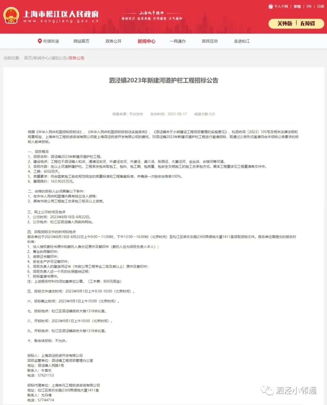泗泾镇2023年新建河道护栏工程招标公告