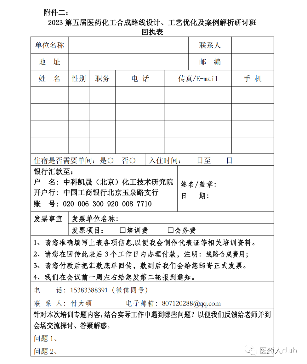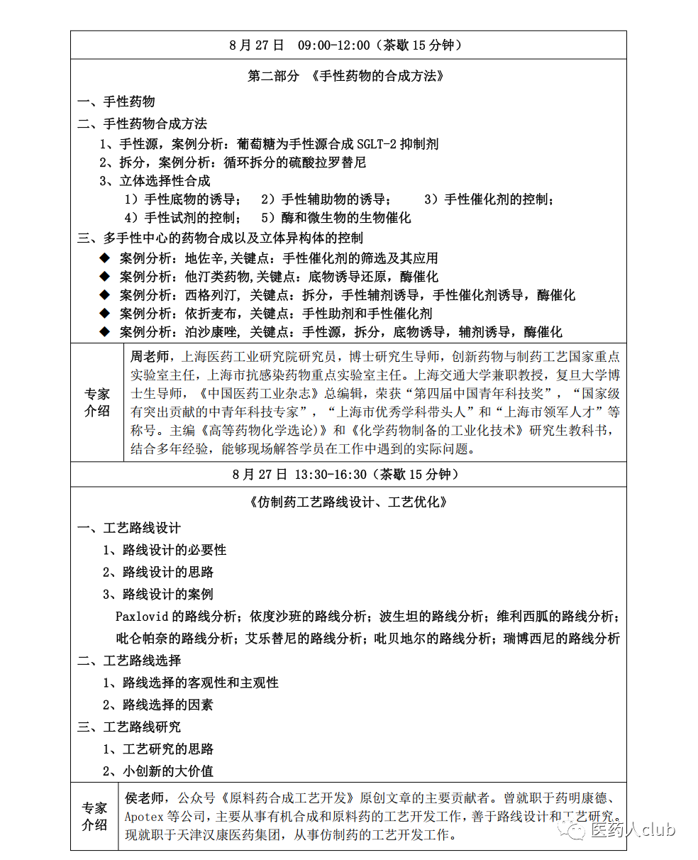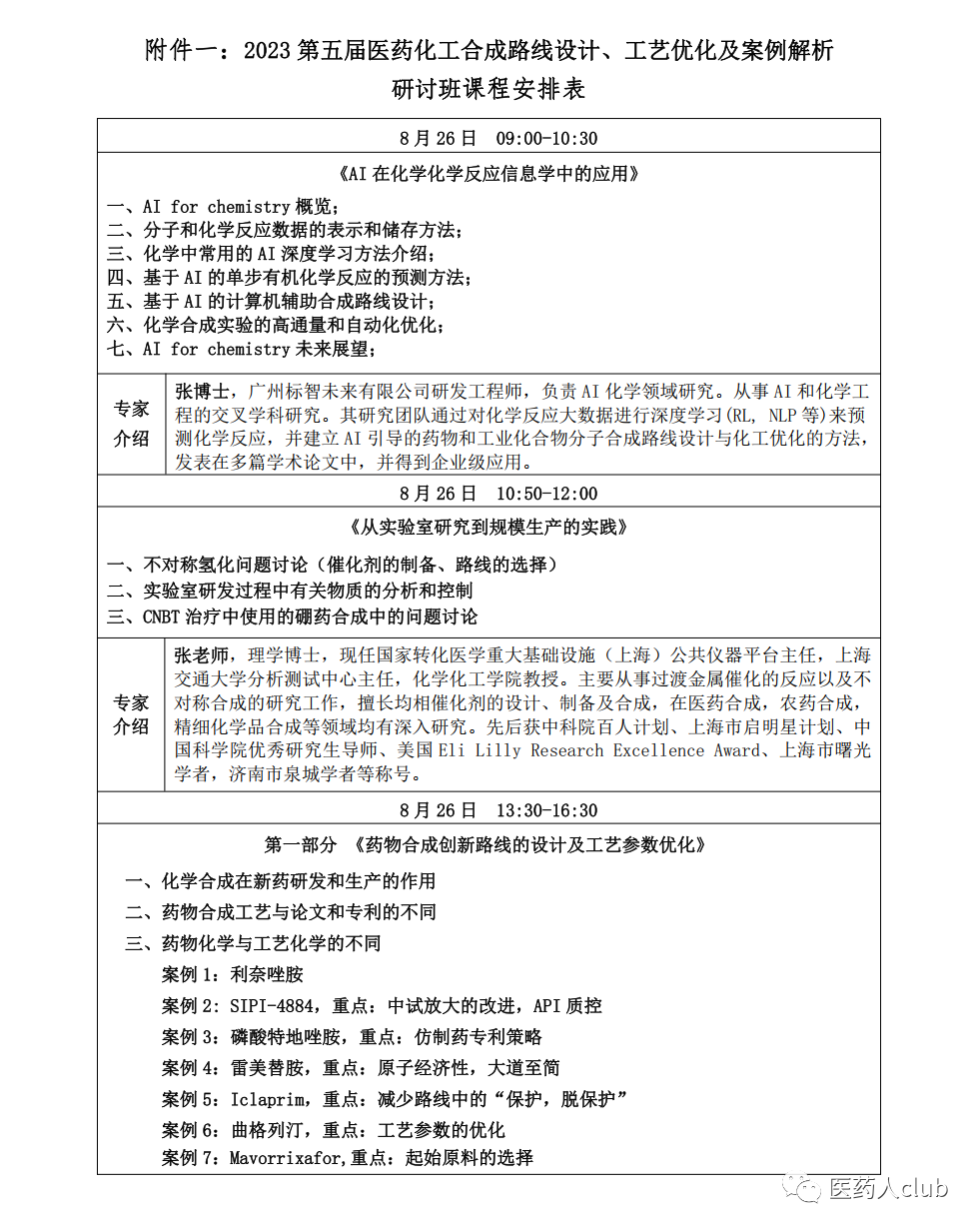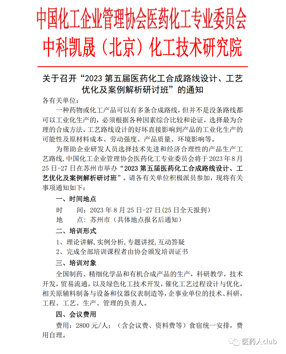为帮助企业研发人员选择技术先进和经济合理性的产品生产工艺路线,中国化工企业管理协会医药化工专业委员会将于2023年8月25日-27日在苏州市举办“2023第五届医药化工合成路线设计、工艺优化及案例解析研讨班”。请各有关单位积极派员参加,现将有关事项通知如下:
