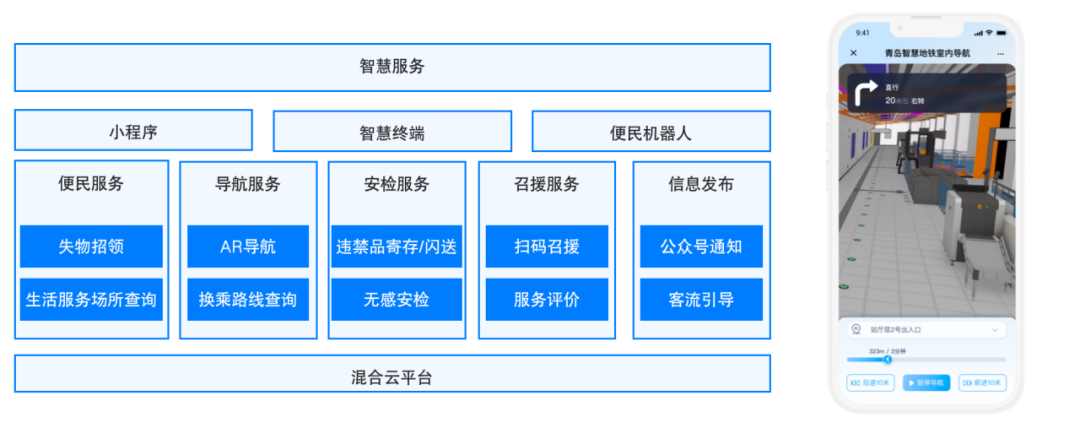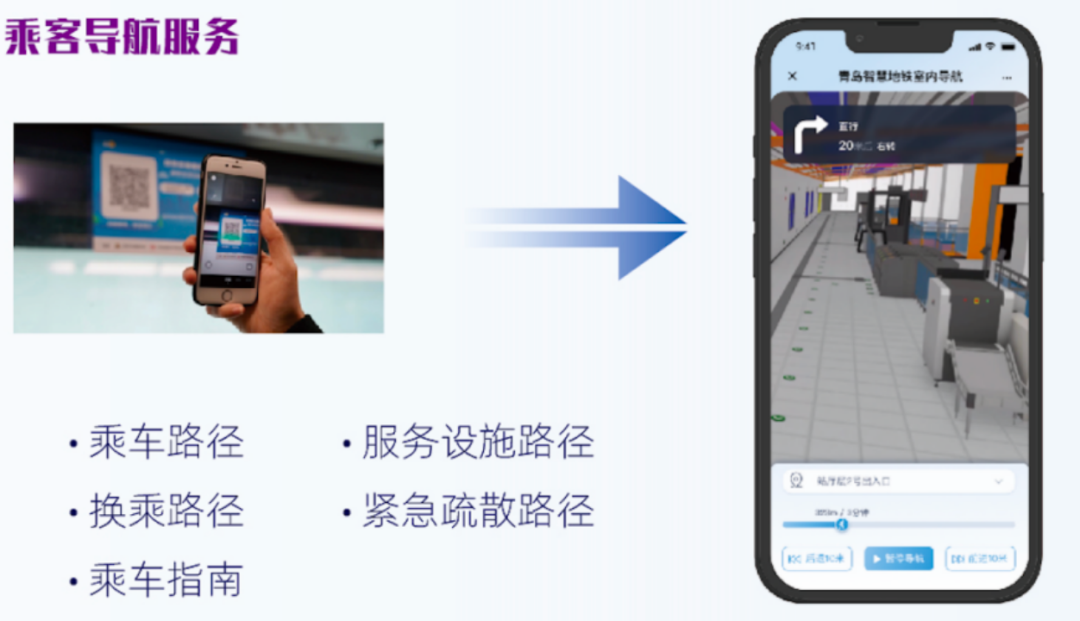结合模型轻量化 BIM 空间三维及地图数据,将空间坐标注入到二维码中,乘客无需下载 APP,通过扫一扫即可获取三维 BIM 空间地图,乘客通过选择地点,即可获取导航路径及地铁乘车指南。