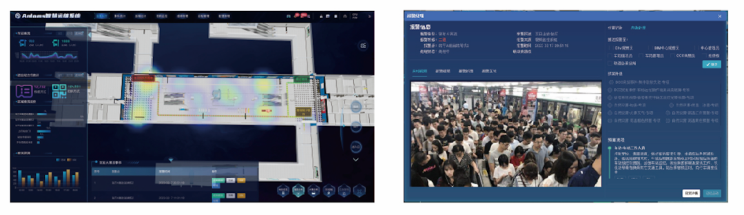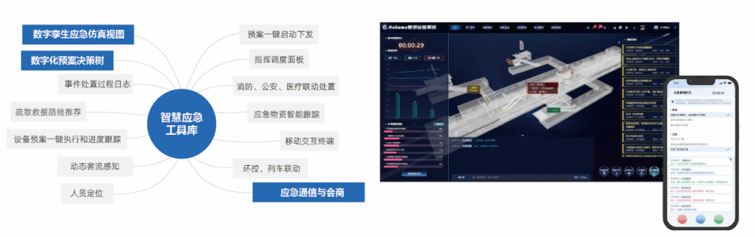 基于数字孪生的应急仿真视图能够帮助应急指挥中心直观了解突发事件的发生时间位置、人员物资分布、人员预案执行情况、设备预案执行状态进度硫散路线、客流分布等多要素信息,同时可通过移动终端与工作人员进行调度指挥和音视频会商等,并且可联动公安、消防、医疗等公共资源和环控调度等部门进行协助处置。数字预案决策树支持将预案内容按照条件、顺序进行结构化拆分,从而实现智能化、自动化的决策和推进,提高处置效率。