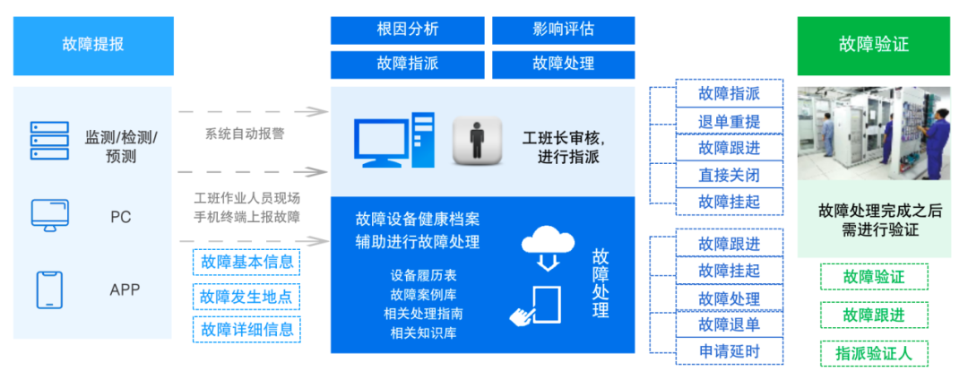 故障上报:除各专业实时监测上报外,还支持在巡检过程中发现之后使用 APP 进行填报,同时也支持 PC 端进行故障填报。