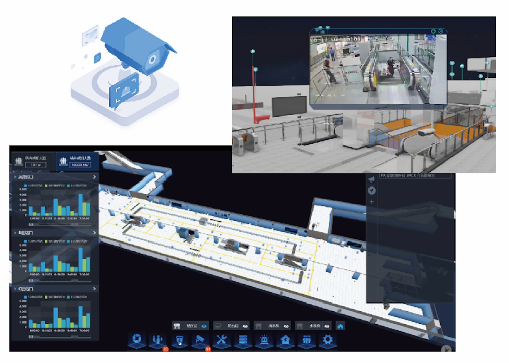 江苏安防打造的智慧运维系统以数字孪⽣、图像算法、物联⽹、GPT⼤模型等技术⼿段,将设备状态数据、健康特征指标、视频图像数据、设备履历数据、专家知识等数据深度融合。通过⼤数据分析,结合⻋站BIM模型通过数字孪⽣技术向中⼼调度、⻋站值班员以及设备维保⼈员提供符合其岗位特点及简洁⾼效的⻋站可视化管家式运维场景,提⾼⻋站运营、设备运保的效率,有助于建设更加安全、⾼效、可持续的轨道交通系统,为乘客提供更好的出⾏体验。