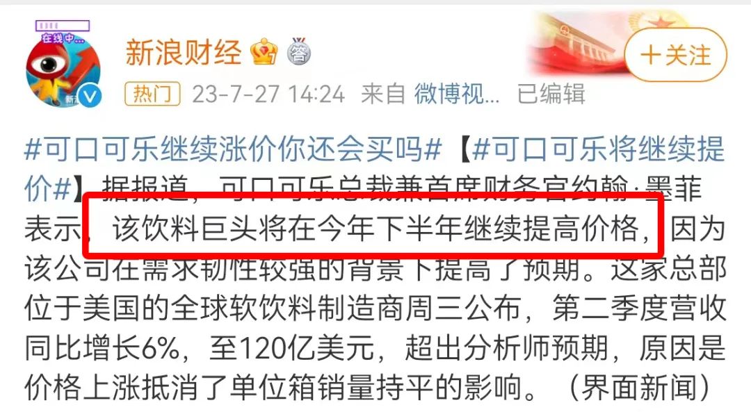 而回归到饮料行业,则是出现了多家媒体的报道 #饮料正在越来越贵 #可乐涨价 #反向消费 #低价饮料消失 的文章,同时在微博、抖音等地方也出现的类似的热搜。