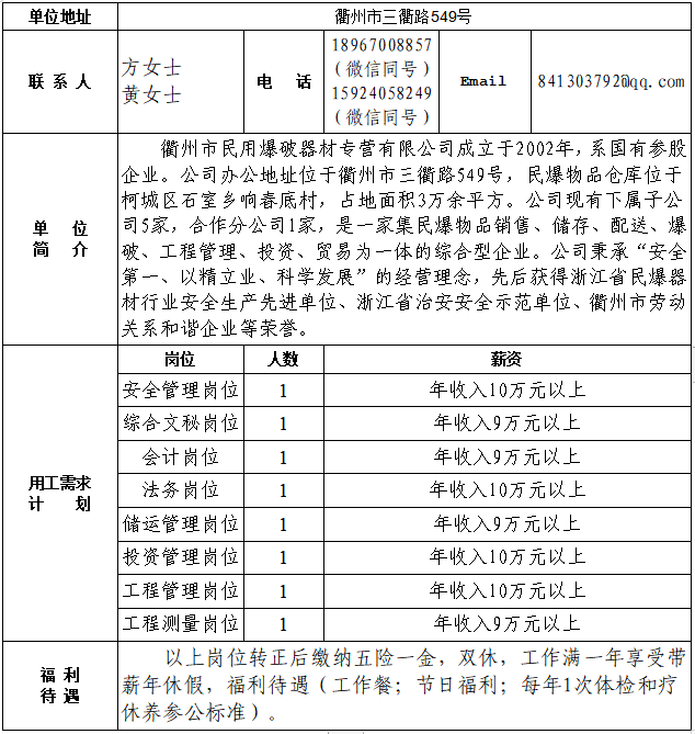 现衢州人才网公众号可推送企业岗位信息,有招聘需求的企业扫码下方二维码填写职位展示表,添加微信(198 5700 5568)提交文件。