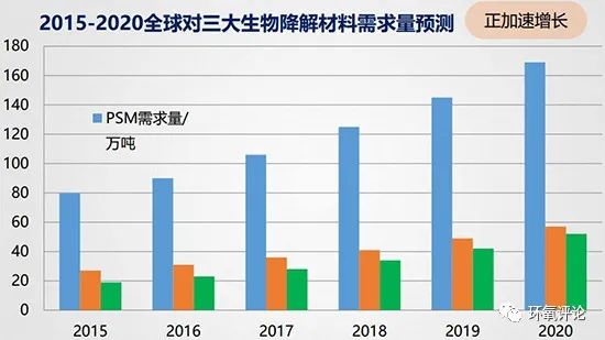图 6 2015-2020全球对三大生物降解材料需求量预测