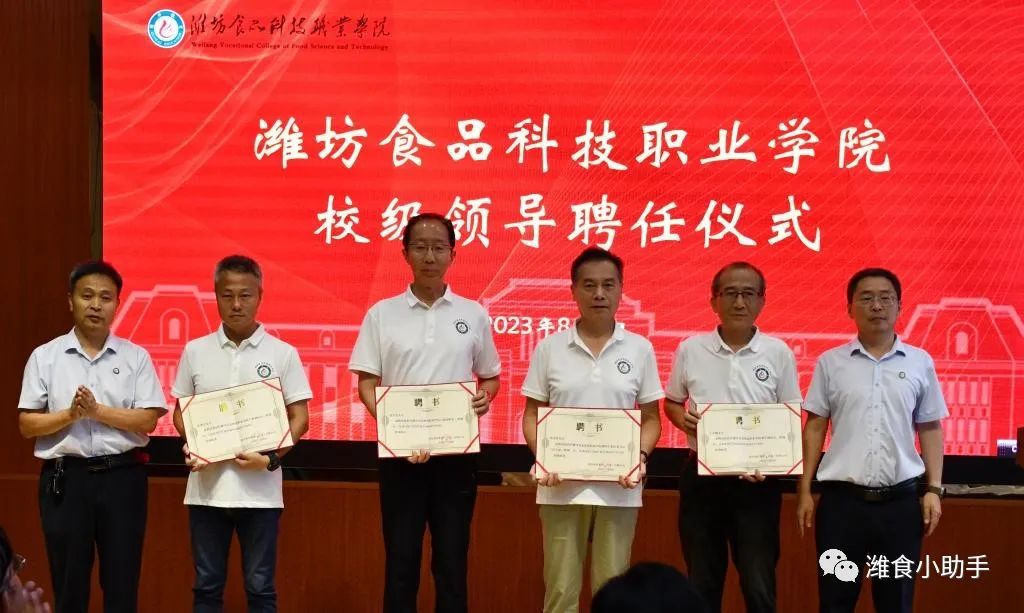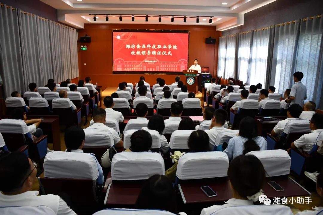 2023年8月8日下午,潍坊食品科技职业学院校领导聘任仪式在青岛国开中学报告厅隆重举行,由国开教育集团副总裁李洪霞主持仪式。国开教育集团董事长王鲁刚、副总裁焦明秀出席仪式,潍坊食品科技职业学院校长张建平、副校长梁国浚、张学东、左中鹅、张博学及我校教职工参加仪式。