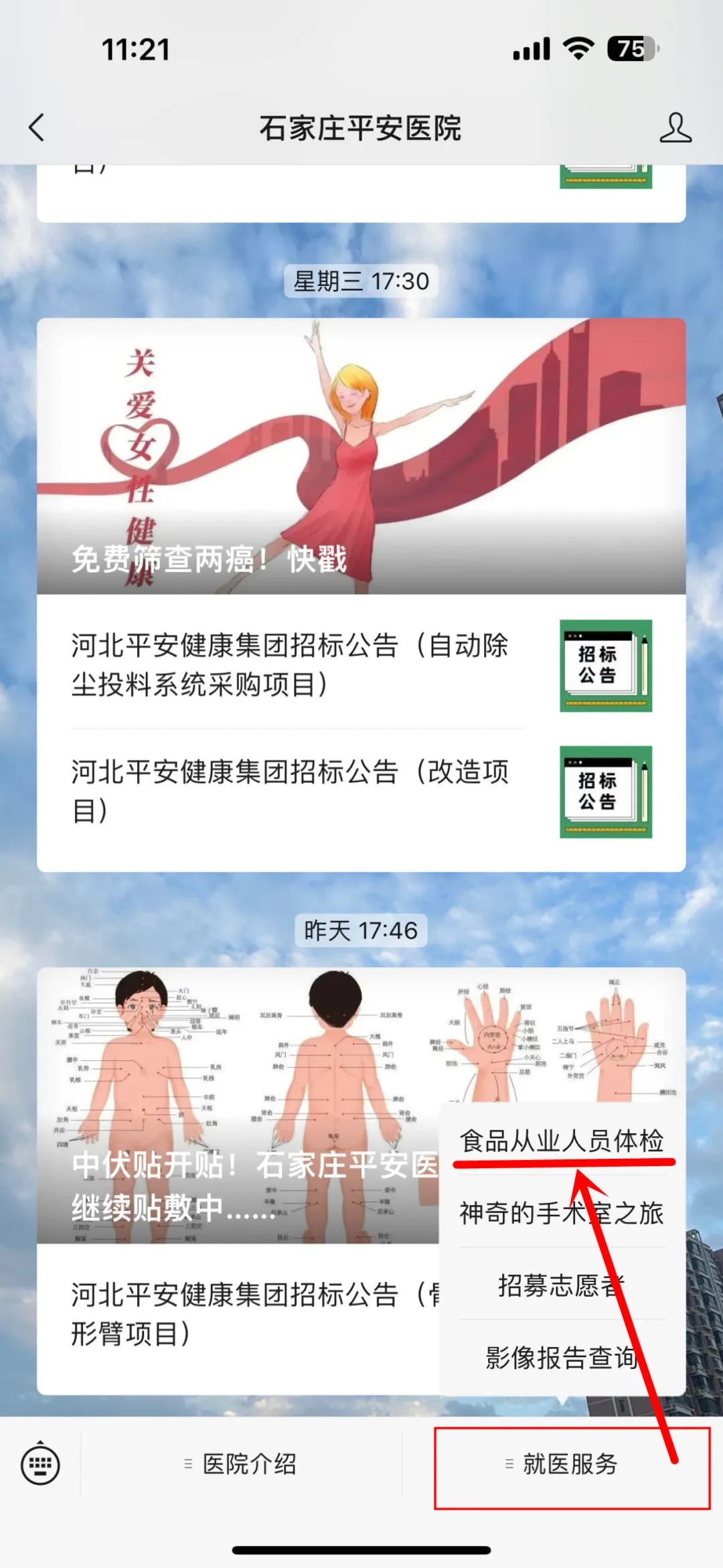 点击菜单栏【就医服务】选择【食品从业人员体检】,完成预约
