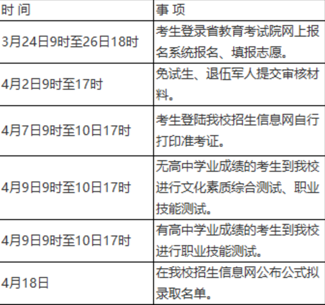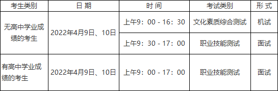 2.职业技能测试(面试)时间:无高中学业成绩的考生为4月9日、10日上午9:30至17:00;有高中学业成绩的考生为4月9日、10日上午9:00至17:00;具体时间以准考证安排为准。