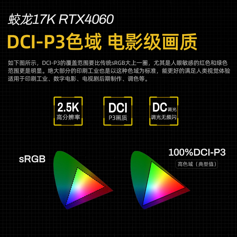 蛟龙17K最大的优点就是它17.3英寸、16:9的QHD高质量大屏,以及DCI-P3 100%广色域,2560x1440高分辨率,满足用户对大屏幕的需求,带来绝佳的视觉体验。