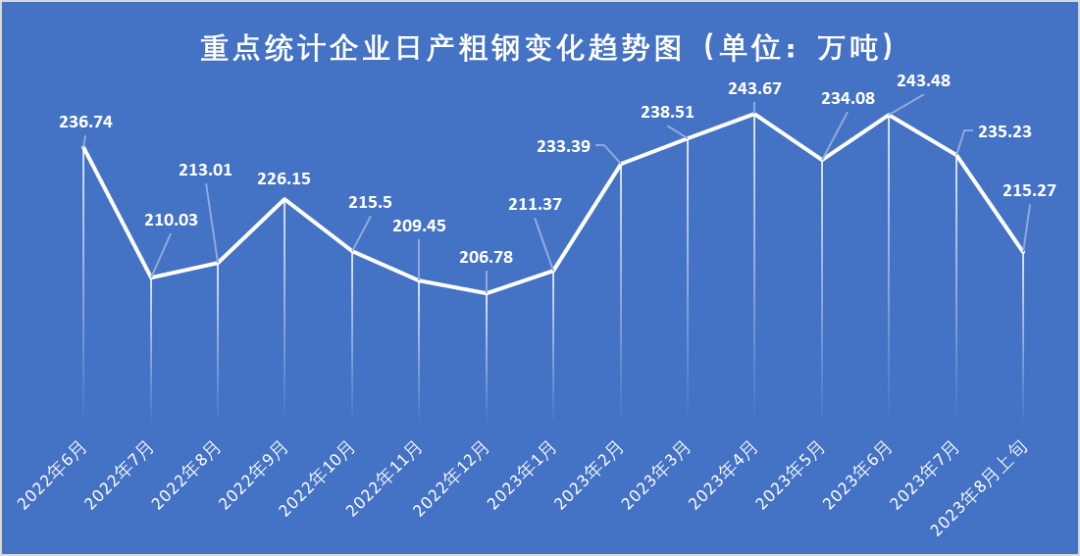 据中钢协数据,7月全国生产粗钢9080.0万吨,同比增长11.50%;8月上旬,重点统计钢铁企业粗钢日产215.27万吨,环比增长0.8%;21个城市5大品种钢材社会库存964万吨,环比增加23万吨,上升2.4%;8月14日—8月18日钢材综合价格指数为108.98点,比上周下降0.64点,比去年年底下降4.27点。