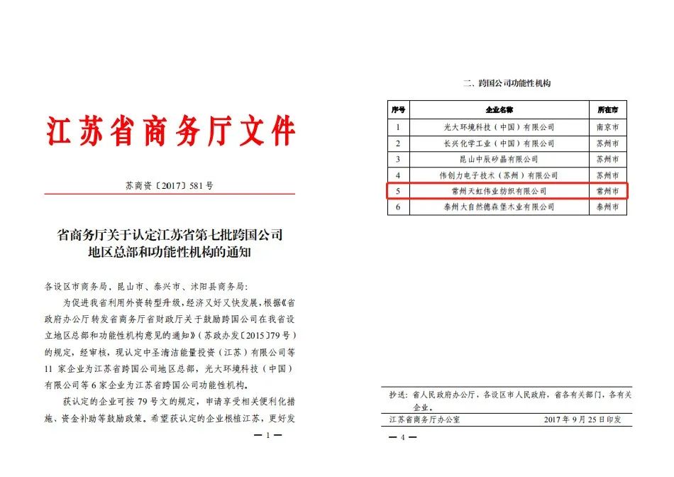 2017年,常州天虹伟业纺织有限公司(现更名为“常州伟业纺织有限公司”)获评江苏省第七批跨国公司功能性机构。