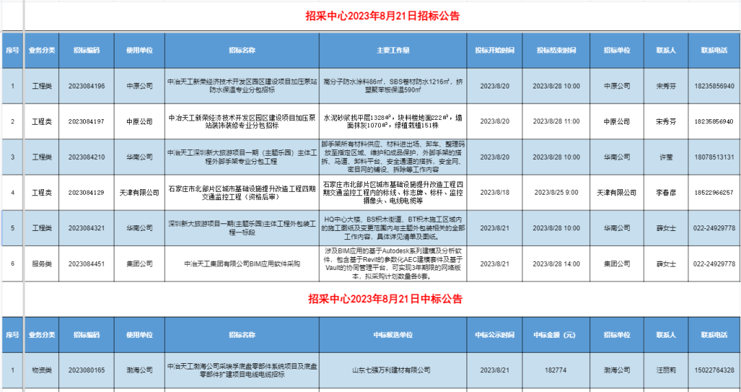 中冶天工招标采购中心对近期的工程项目进行招标,现诚邀分包商、供应商欢迎参与投标(分包、物资在一个图片内,请注意业务分类)。