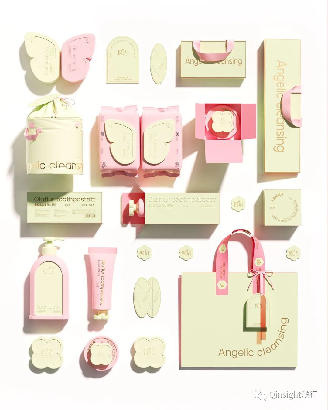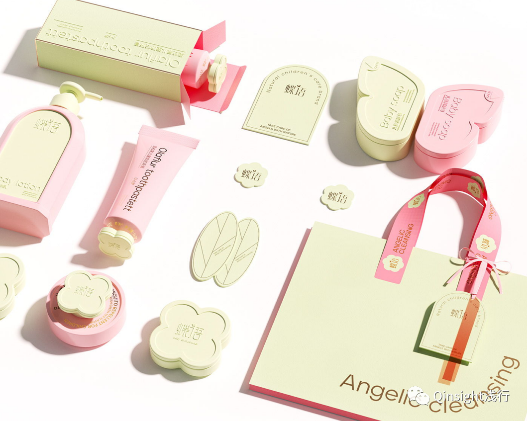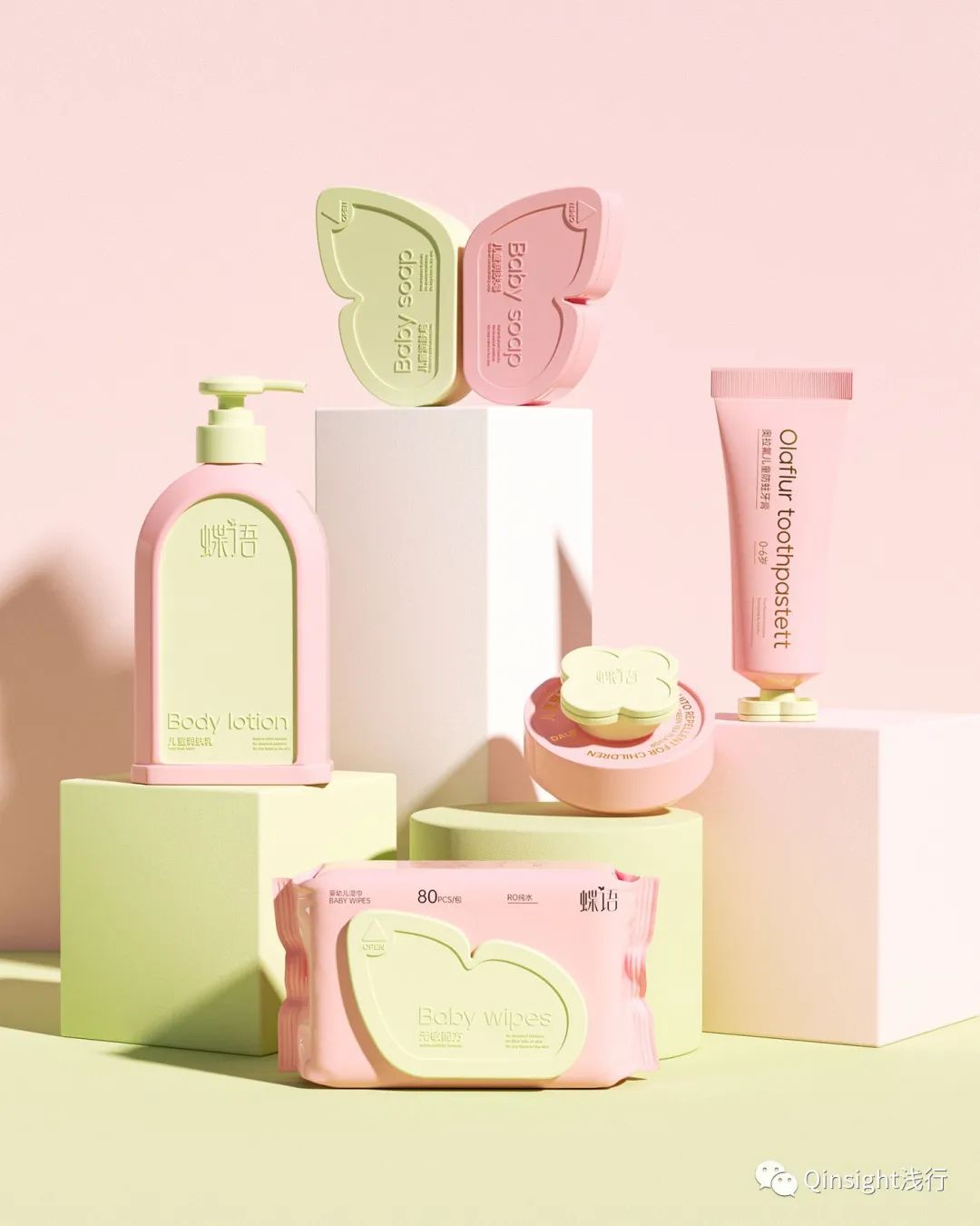 “蝶语”是为婴儿设计护理品牌,其包装是柔软与甜美的令人愉悦的融合。蝴蝶和花帽等独特的包装形状完美地捕捉了该品牌温柔的本质,唤起一种温柔和关怀的感觉。无衬线字体的选择进一步增强了包装的柔和气质,完美地补充了整体设计主题。该婴儿护理品牌的包装不仅保护了内部珍贵的产品,还为父母和孩子们创造了可爱的体验。