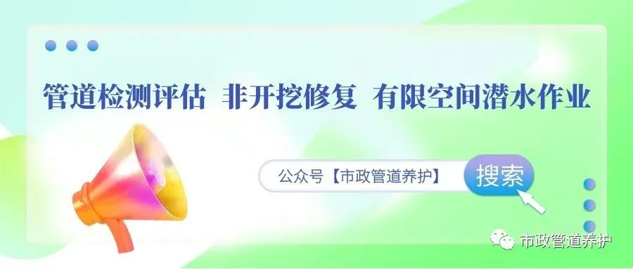 编者:《市政管道养护》公众号是管道养护人自己的公众号,主要针对管养人的技术发明、创新创造进行宣传推广;对市政养护行业的新技术、新设备、新材料进行应用推广;对管养人励志故事进行宣传;不定期邀请行业相关专家对国家相关行业政策进行深度分析解读;管道养护招投标信息发布;优秀企业招聘信息的发布;优秀人才的推荐等。为办好我们的公众号,欢迎读者同仁们提出宝贵意见和建议,积极来函投稿,投稿信箱lsmin0518@163.com,本站采编将会择优采用,实时发布。