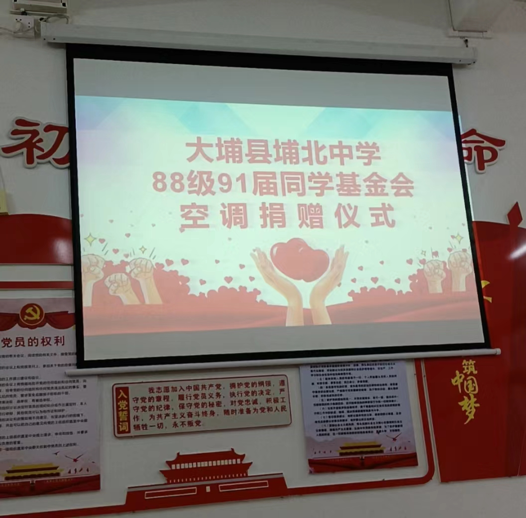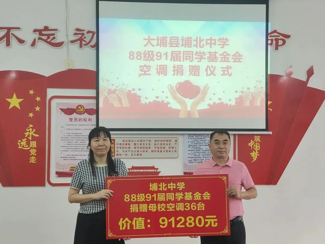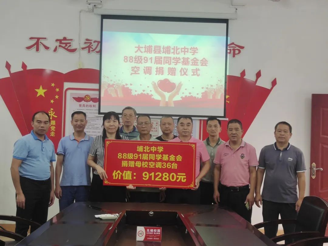 张丽宝同学代表88级91届同学基金会向埔北中学捐赠36台空调,价值人民币91280元。