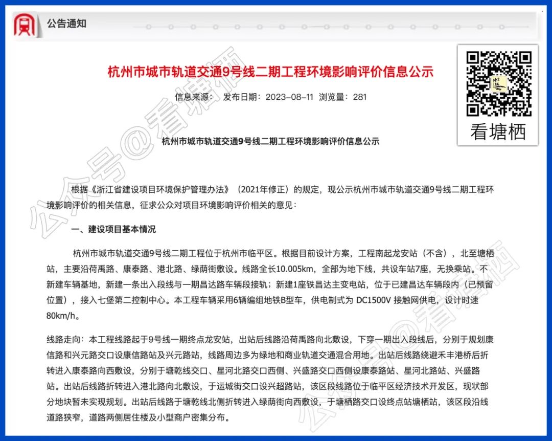 杭州市城市轨道交通9号线二期工程位于杭州市临平区。根据目前设计方案,工程南起龙安站(不含),北至塘栖站,主要沿荷禹路、康泰路、港北路、绿荫街敷设。线路全长10.005km,全部为地下线,共设车站7座,无换乘站。不新建车辆基地,新建一条出入段线与一期昌达路车辆段接轨;新建1座铁昌达主变电站,位于已建昌达车辆段内(已预留位置),接入七堡第二控制中心。本工程车辆采用6辆编组地铁B型车,供电制式为 DC1500V 接触网供电,设计时速80km/h。