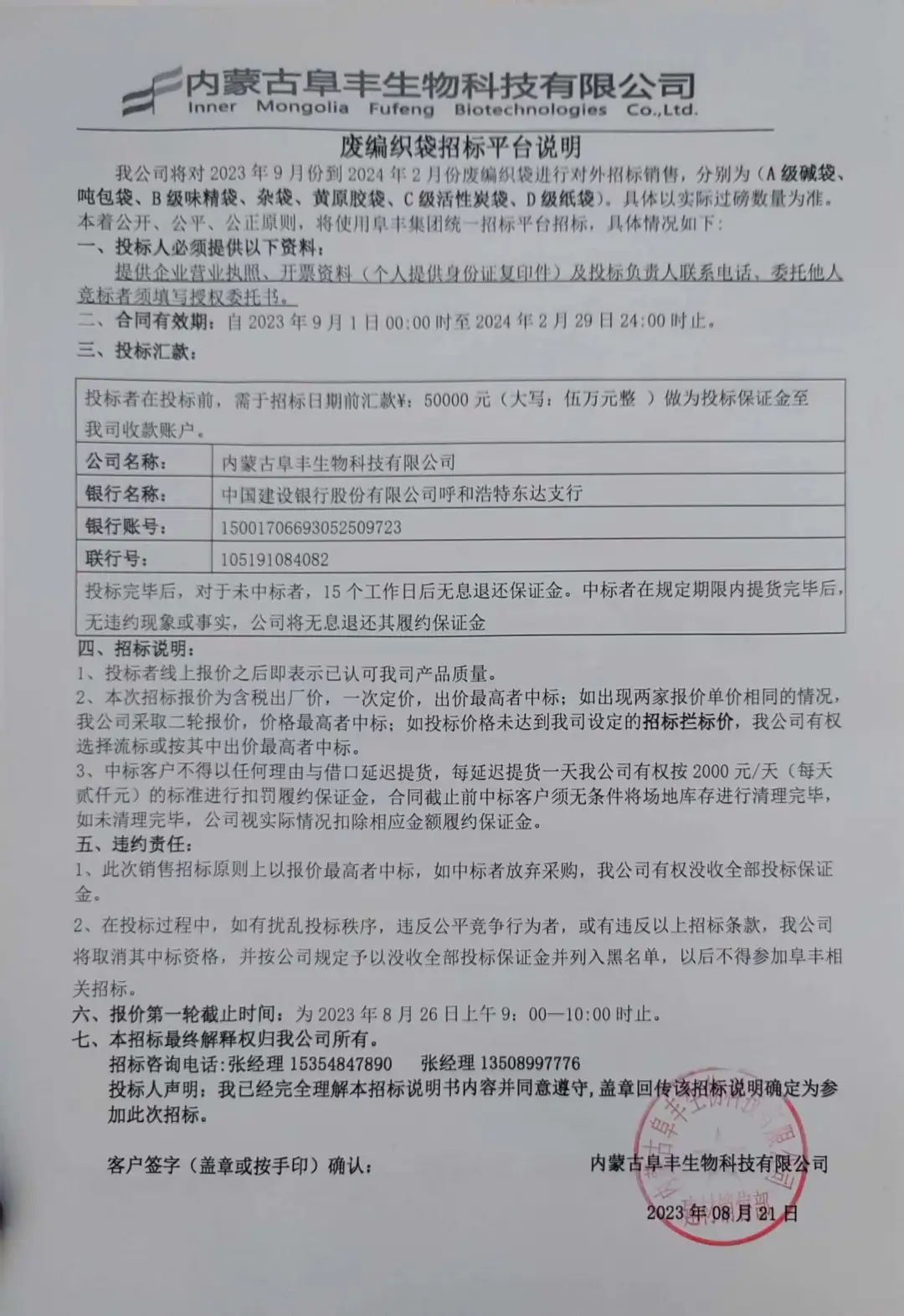 我公司将对2023年9月份到2024年2月份废编织袋进行对外招标销售,分别为(A级碱袋、吨包袋、B级味精袋、杂袋、黄原胶袋、C级活性炭袋、D级纸袋)。具体以实际过磅数量为准。本着公开、公平、公正原则,将使用阜丰集团统一招标平台招标,具体情况如下: