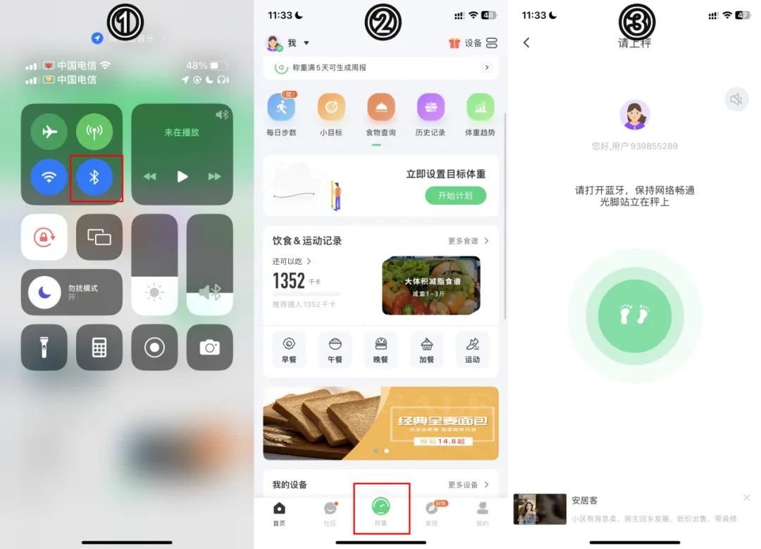 ②打开手机蓝牙,点击app页面中心称重按钮