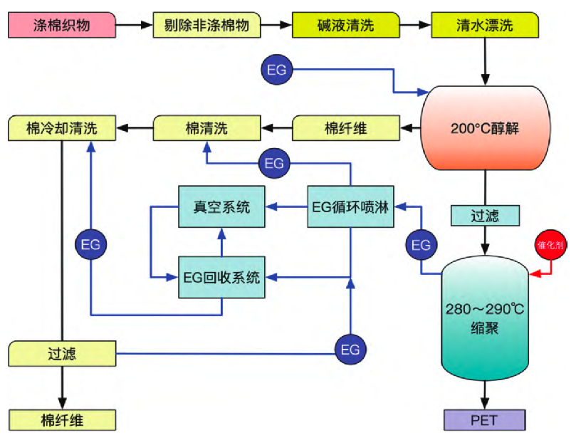 ·化学法是破坏废旧纺织品内部分子结构,得到再生纤维素、蛋白质或者生物炭材料。回收后材料经过纺丝、交联、改性等加工,做成纺织原材料再利用。