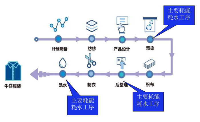 牛仔服装行业生产流程长,生产过程需要消耗能源、水、各种化学品以及劳动力,并产生废水、废气和固废,对环境产生一定的影响。牛仔服装的生产备受社会的关注。降低生产所需的能耗和水耗,减少生产的各种污染物,提高生产效率和降低生产强度,实现牛仔服装的循环再用,是牛仔服装生产新技术发展的方向。