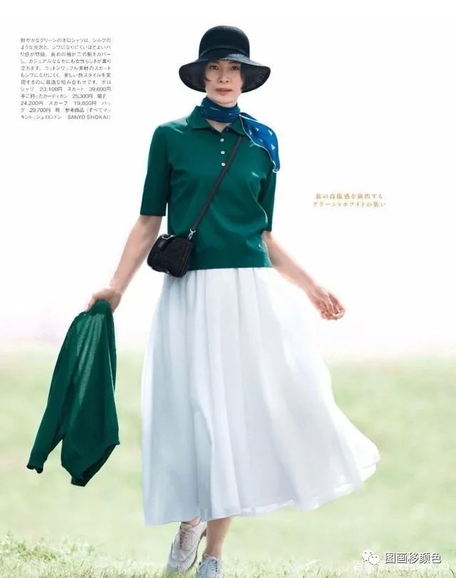 蓝色和绿色都是很适合四十岁以上的女性采用的色系,尤其是这款绿色的POLO上衣,它的轮廓设计并不会紧紧地附着在曲线上,穿起来舒服,搭配一款白裙,也很清新。