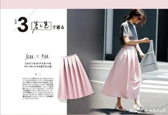像这条粉色的半身裙,它就不会直接影响肤色,而是能对造型的整体风格塑造有扭转作用,搭配简单的浅灰色T恤,显眼又时尚。